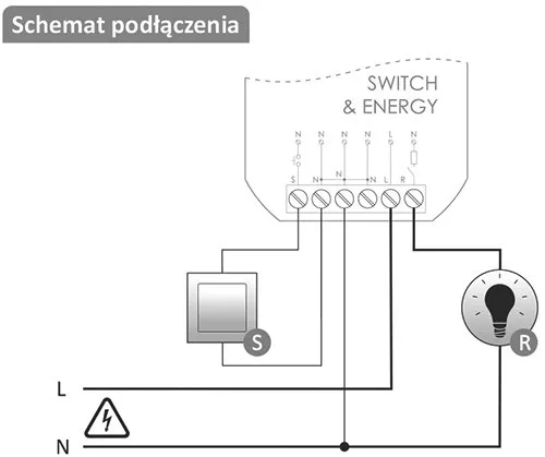 SWITCH & ENERGY Pojedynczy przekaźnik Wi-Fi 230V z funkcją monitorowania parametrów sieci.