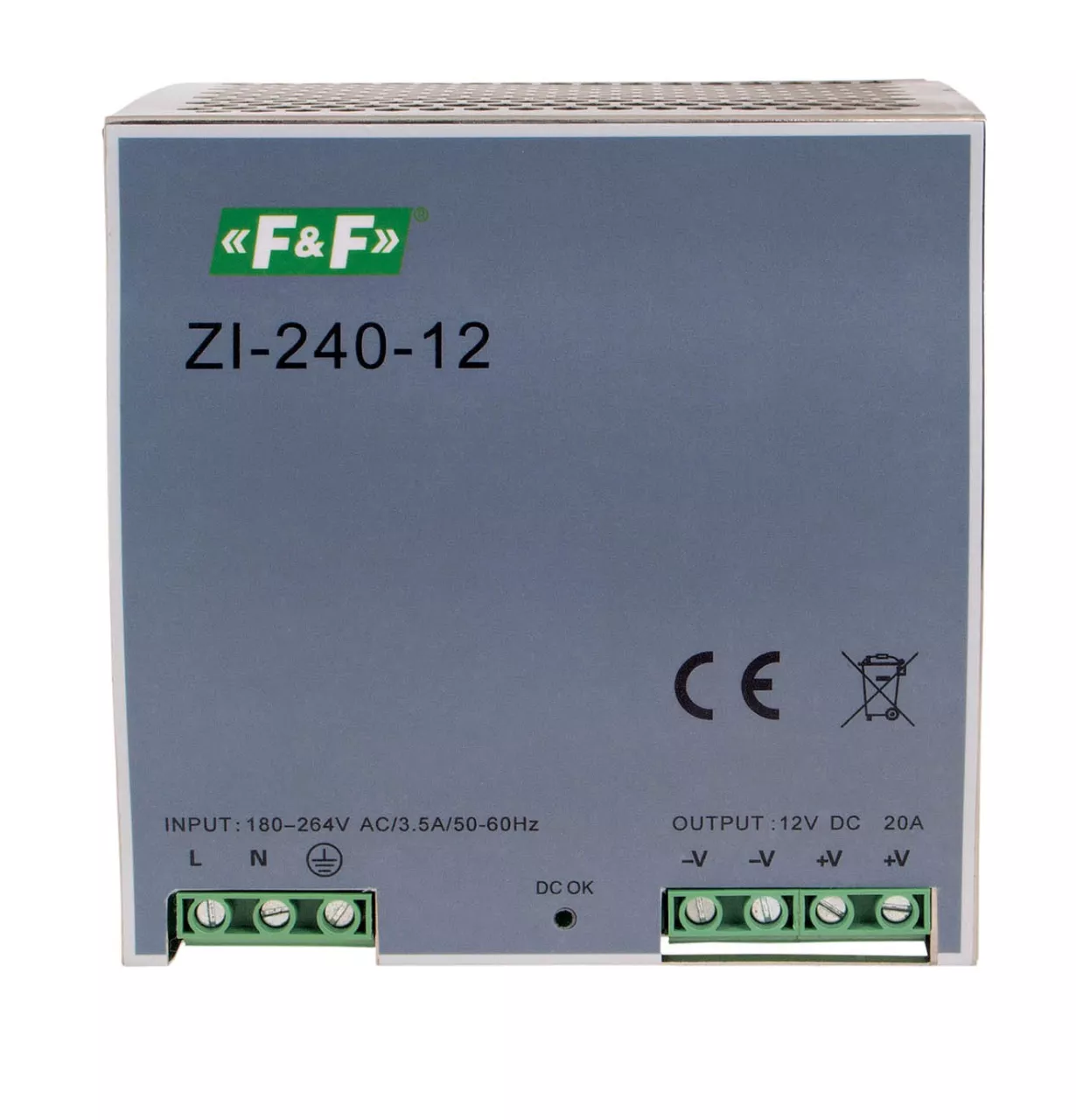Typ zasilacz impulsowy Napięcie zasilania 180÷264 V AC Częstotliwość 50÷60 Hz Maksymalny prąd obciążenia 20 A Napięcie wyjściowe OUT 12 V DC Moc wyjściowa 240 W Minimalne obciążenie 0% Częstotliwość kluczowania 100 kHz Przeciążenie 150%/3 min Napięcie przebicia WE-WY 3 kV Masa 960 g Przyłącze zaciski śrubowe 4,0 mm² Moment dokręcający 0,5 Nm Temperatura pracy -10÷70°C Wymiary 130 mm x 127 mm x 115 mm Montaż na szynie 35 mm Stopień ochrony IP20