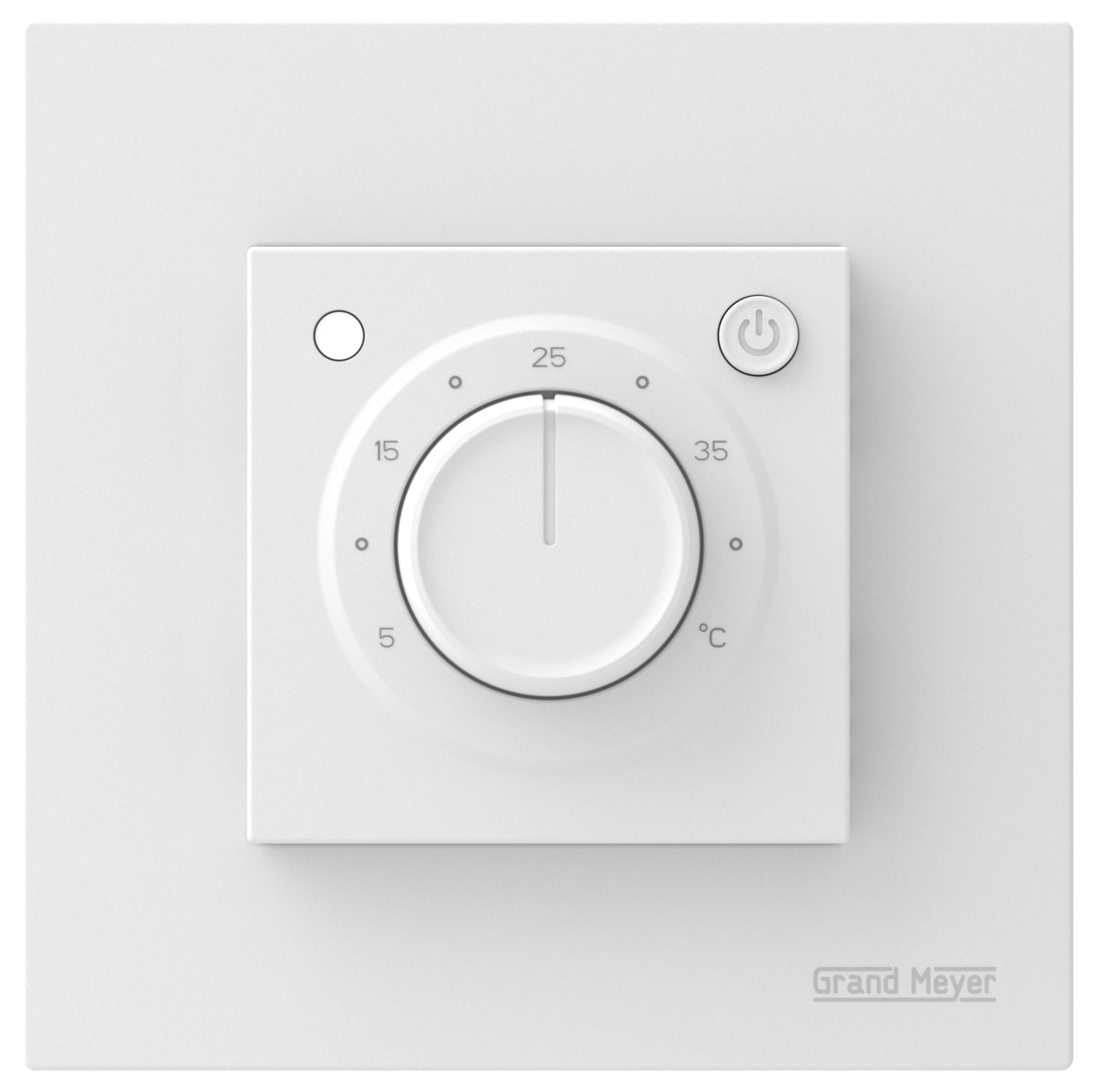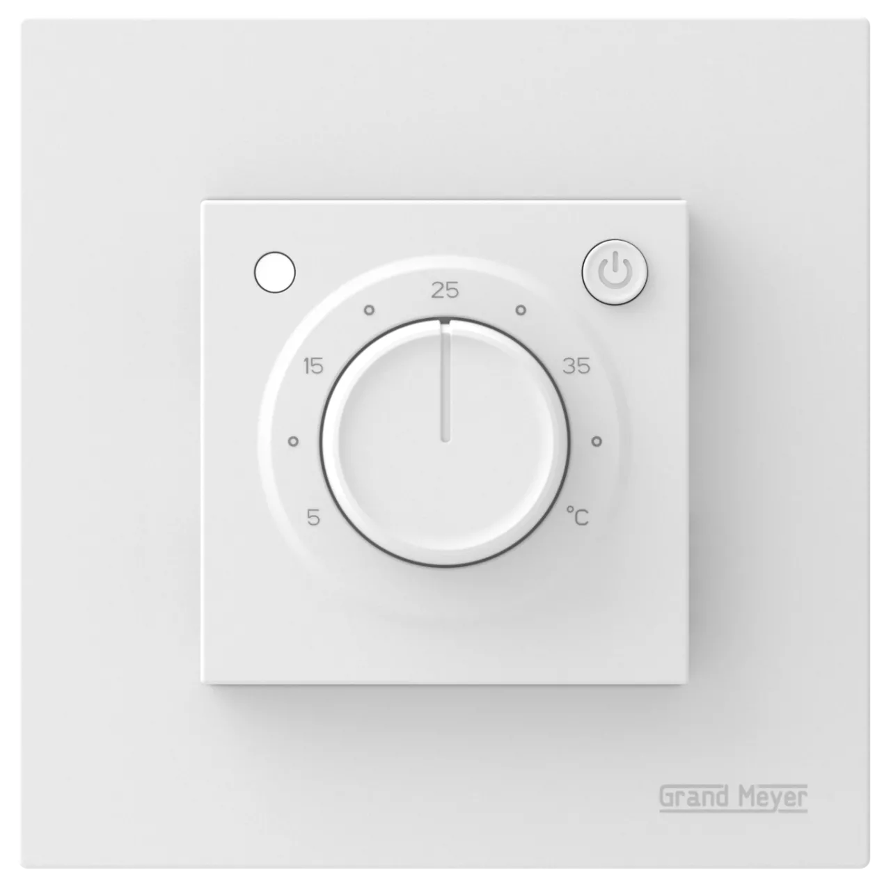 Manualny termostat Grand Meyer MST-9 do montażu w ramki różnych producentów (Schneider Electric, Berker itp.), w tym w ramki wielokrotne. Pasuje do ramek o wymiarach wewnętrznych 46mm x 46mm oraz 56mm x 56mm (za pomocą adapteru). Dostarczany z 3m czujnikiem podłogowym NTC. Montaż w standardowej puszce podtynkowej. Zakres nastawy temperatury od +5 do +40°C. Dioda LED sygnalizuje włączenie ogrzewania. Zasilanie napięciem 230 V.