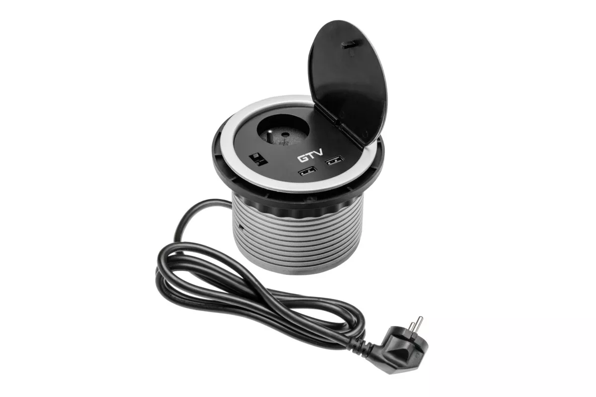 PRZEDŁUŻACZ BIURKOWY WPUSZCZANY 1 GNIAZDO Z UZIEMNIENIEM, ŁADOWANIE USB 5V 2A, Z KABLEM ZASILAJĄCYM 1.5m Z WTYCZKĄ, SREBRNY
