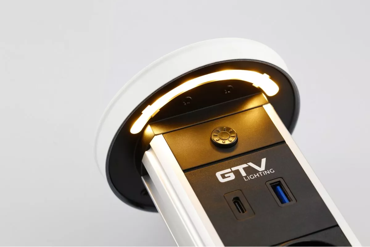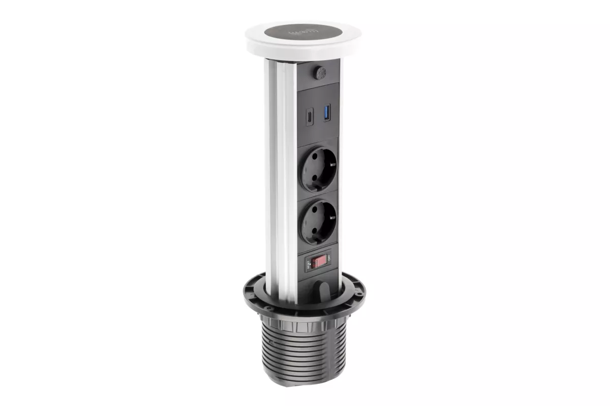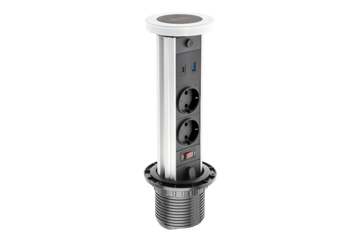 PRZEDŁUŻACZ BIURKOWY WPUSZCZANY CAMINO 80mm, 2x GNIAZDO SCHUKO, USB A+C, ŁADOWARKA INDUKCYJNA 10W, PRZEWÓD 1,5m, BIAŁY