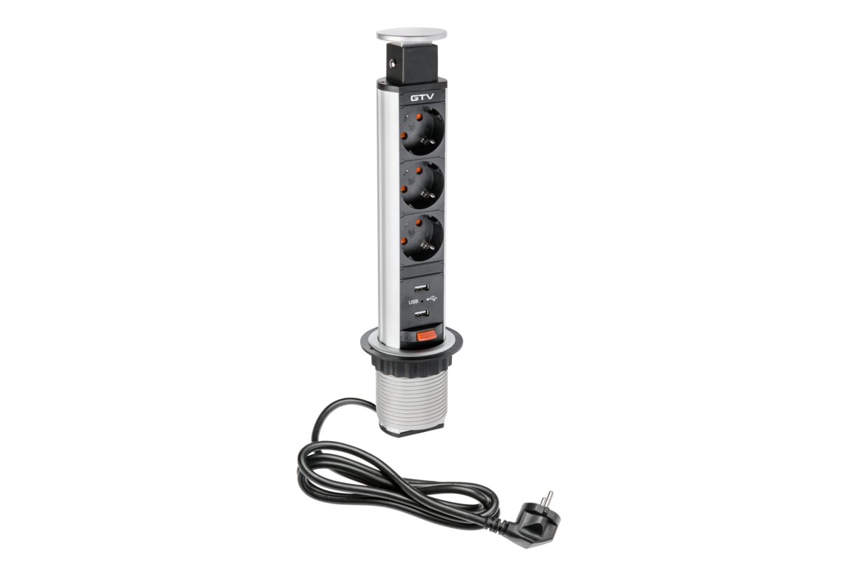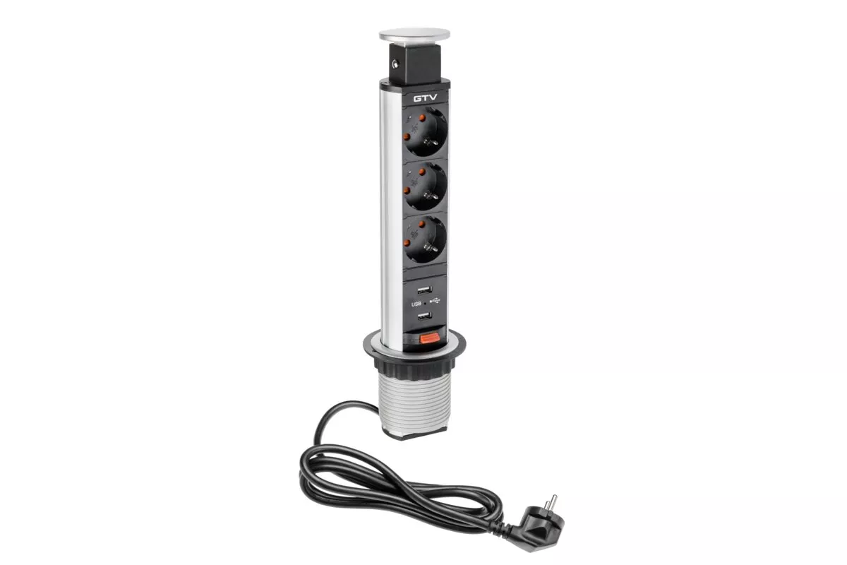 BIURKOWY PRZEDŁUŻACZ WPUSZCZANY 60mm, 3X SCHUKO, 2XUSB 2,1A 5V (SREBRNY)