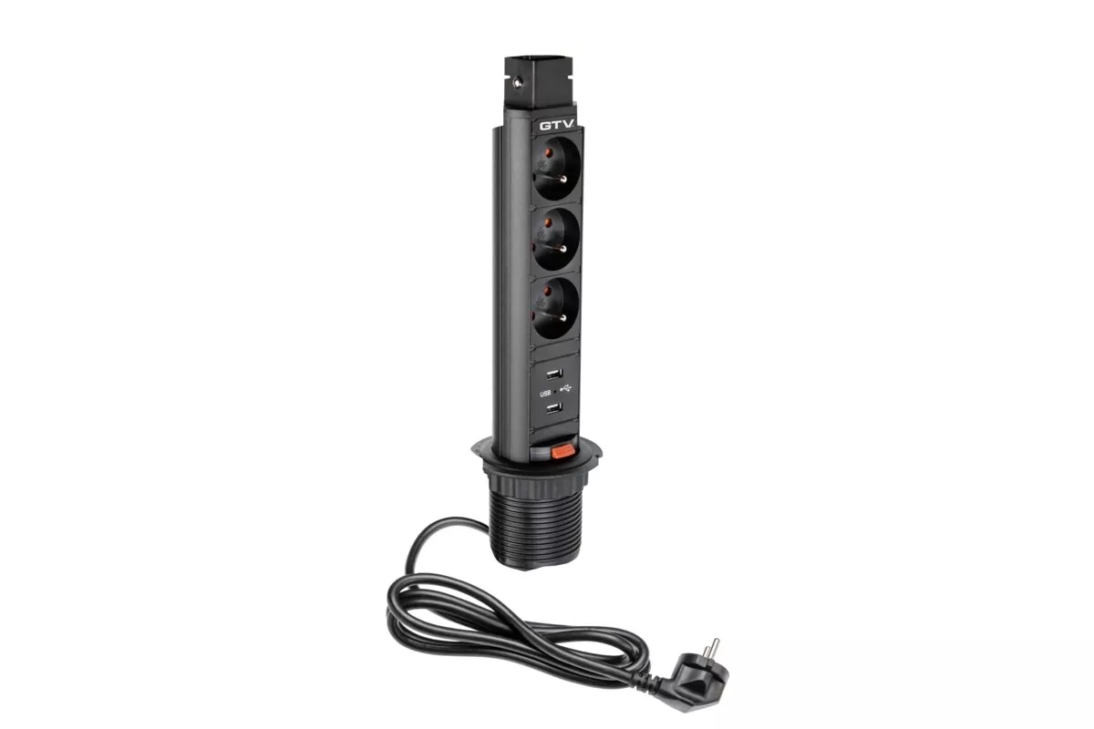 BIURKOWY PRZEDŁUŻACZ WPUSZCZANY 60mm, 3X GNIAZDO Z UZIEMIENIEM, 2XUSB 2,1A 5V (CZARNY)