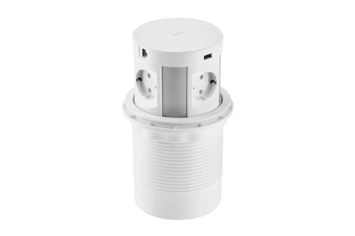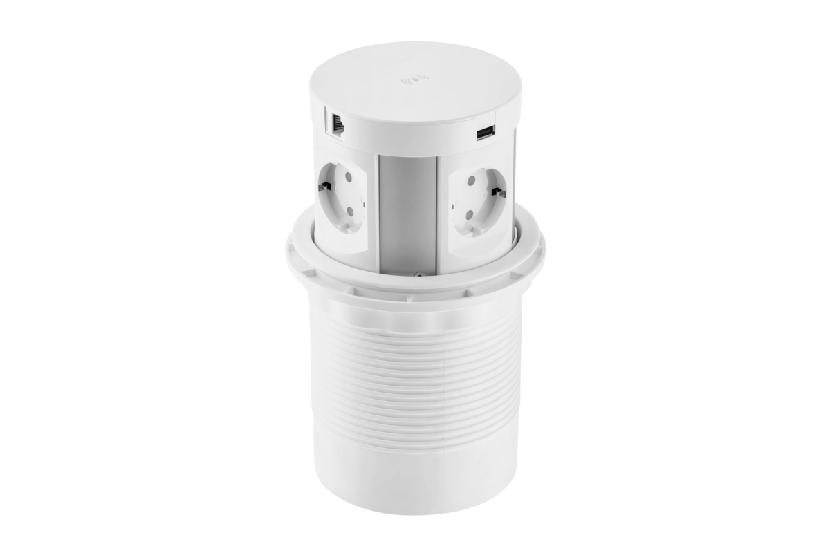 PRZEDŁUŻACZ BIURKOWY WPUSZCZANY COMFORT PLUS 120mm, 4x GNIAZDO SCHUKO, 2xUSB, 2xRJ45, ŁADOWARKA INDUKCYJNA 5W, PRZEWÓD 1,5mb, BIAŁY