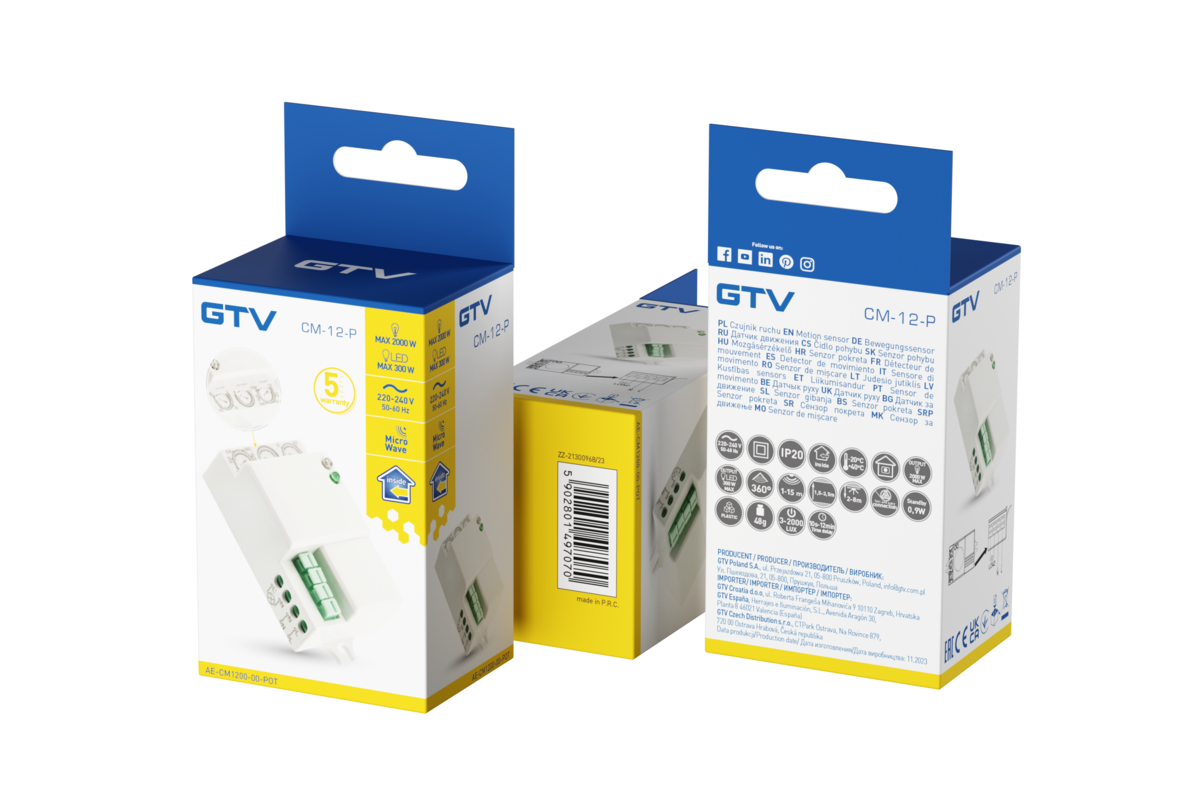 CZUJNIK RUCHU MIKROFALOWY CM-12-P, max.1200W, AC220-240V, KĄT DZIAŁANIA 360*, ZASIĘG 15m
