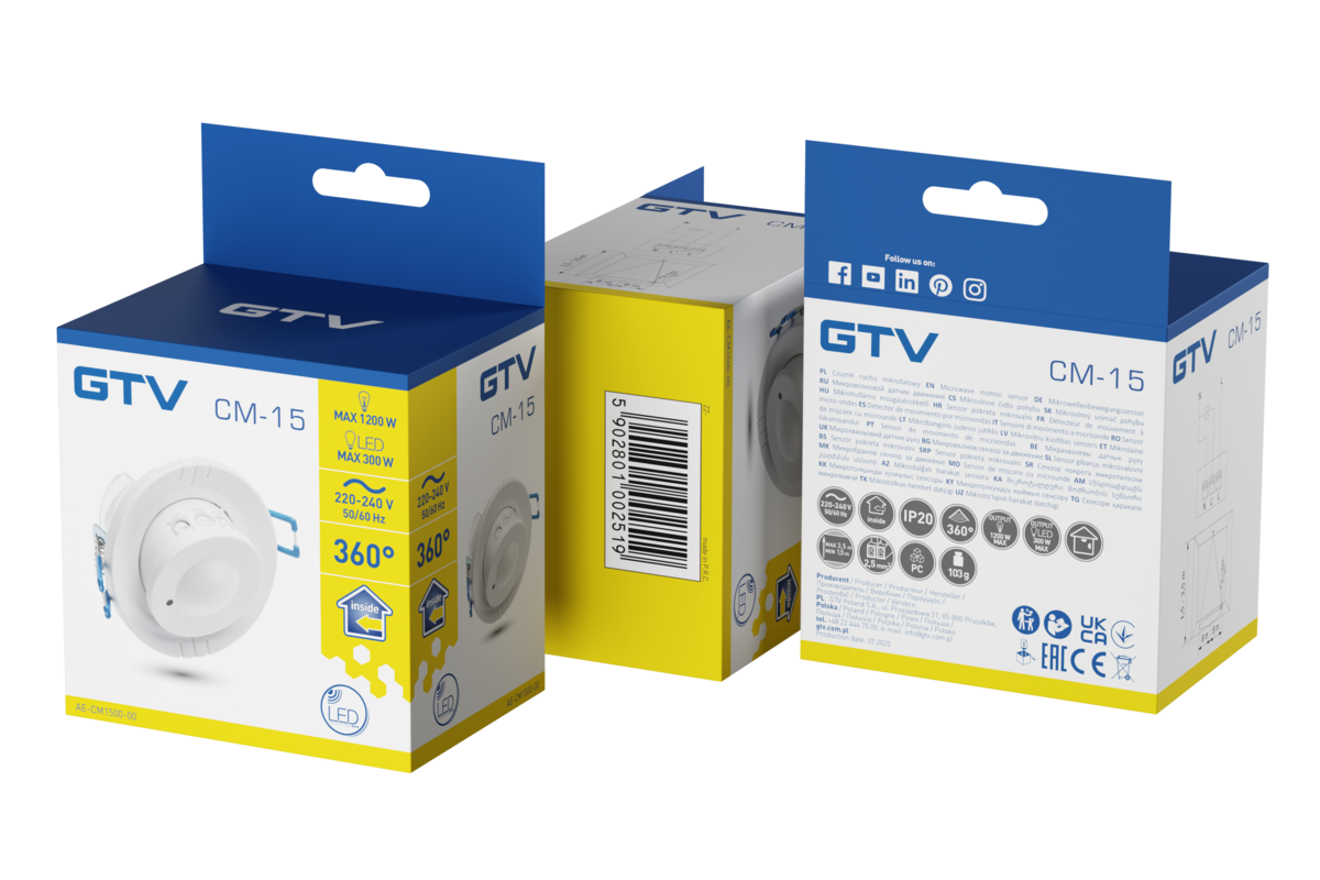 CZUJNIK MIKROFALOWY RUCHU CM-15, AC220-240V, 50/60Hz, 360°, IP20, WSPÓŁPRACUJE Z LED, WPUSZCZANY, BIAŁY