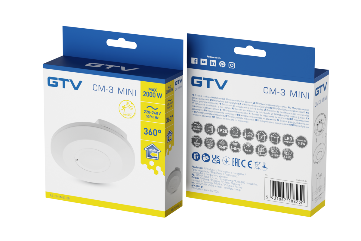 CZUJNIK MIKROFALOWY RUCHU CM-3 MINI, max 2000W, AC220-240V, 50/60Hz, KĄT DZIAŁANIA 360*, ZASIĘG 1-8m ± 2- 6m, IP20, WSPÓŁPRACUJE Z LED, NATYNKOWY, BIAŁY