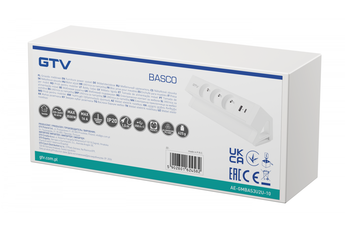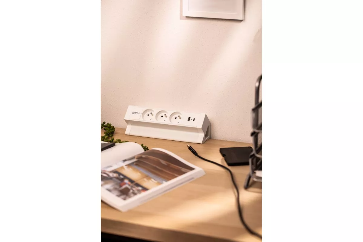 GNIAZDO MEBLOWE BASCO, 3 X GNIAZDO Z UZIEMIENIEM, USB A+C, KABEL 1,5m, BIAŁE Z MOCOWANIEM