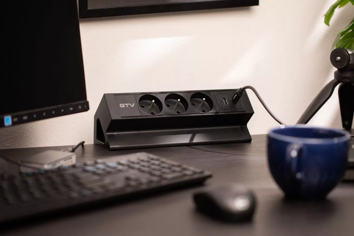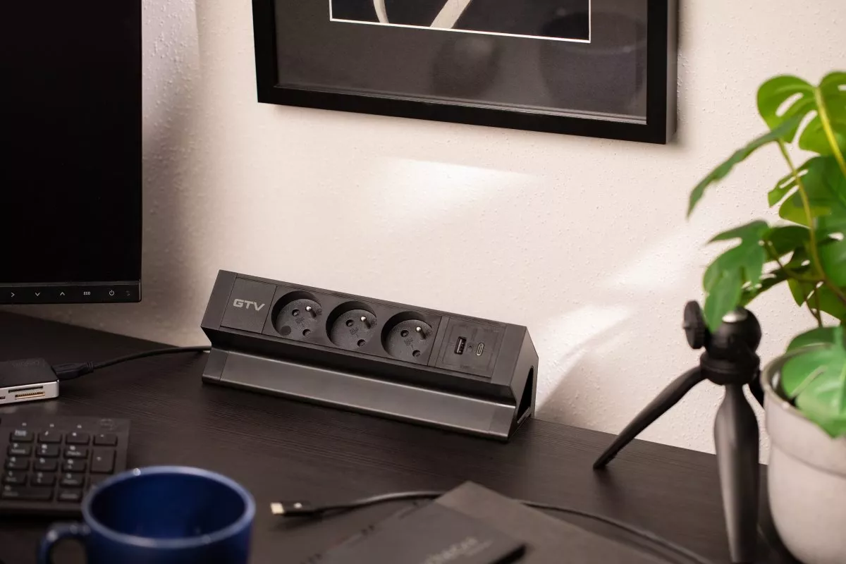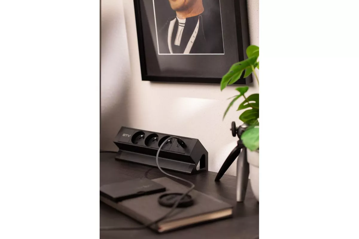 GNIAZDO MEBLOWE BASCO, 3 X GNIAZDO Z UZIEMIENIEM, USB A+C, KABEL 1,5m, CZARNE Z MOCOWANIEM