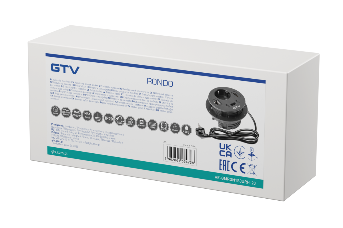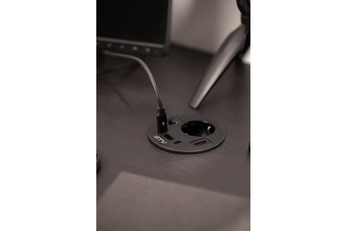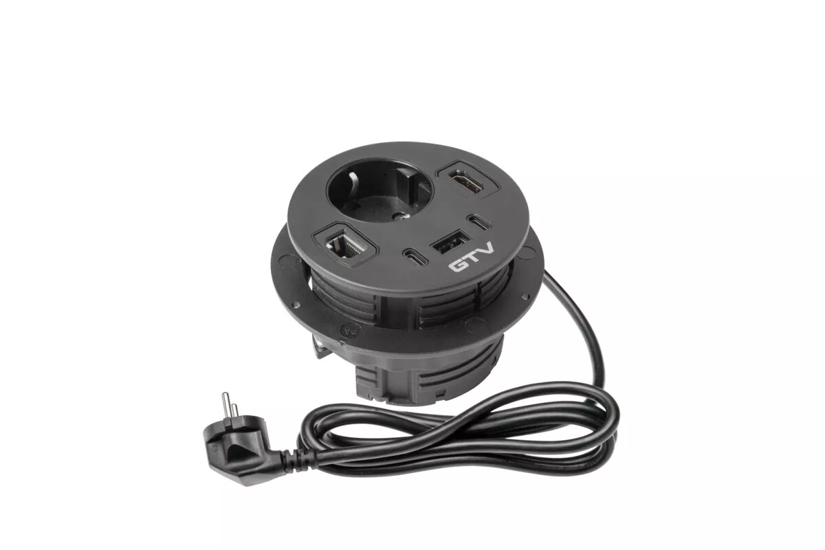 GNIAZDO MEBLOWE WPUSZCZANE RONDO, 1 X GNIAZDO SCHUKO, 1 X USB A + 2 X USB C, 1 X RJ45, 1 X HDMI, KABEL 1,5m, CZARNE