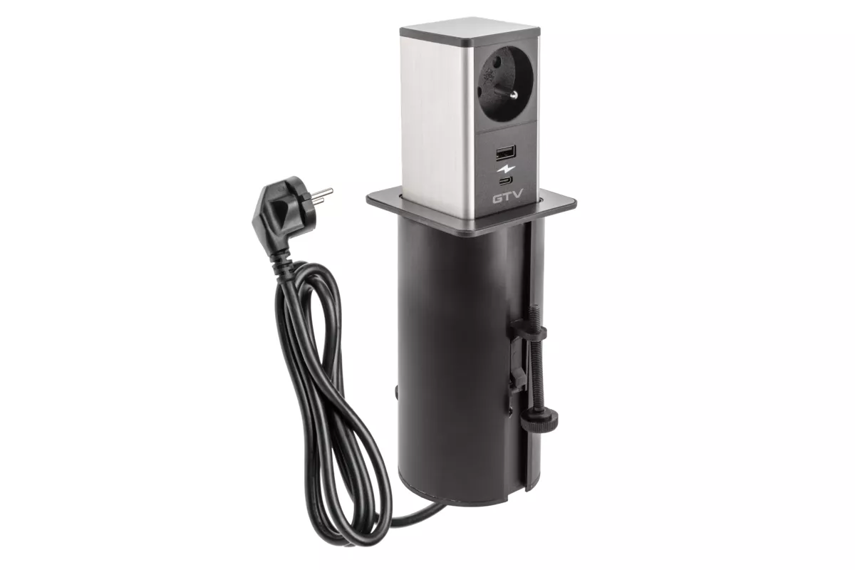 GNIAZDO MEBLOWE WYSUWANE TOWER, 1x GNIAZDO FRENCH, 1xUSB A, 1xUSB C, KABEL 1,5m, CZARNE, KAPSEL INOX