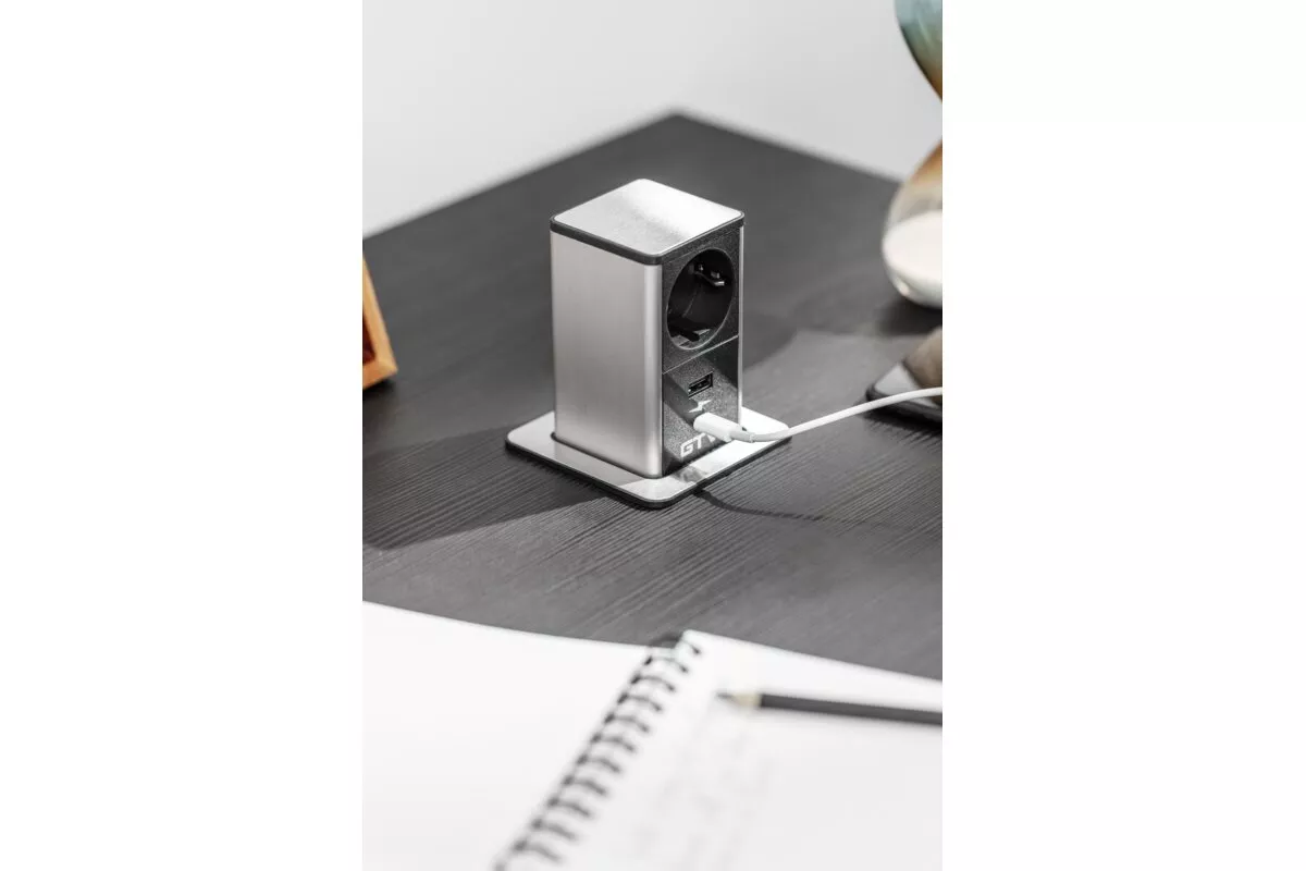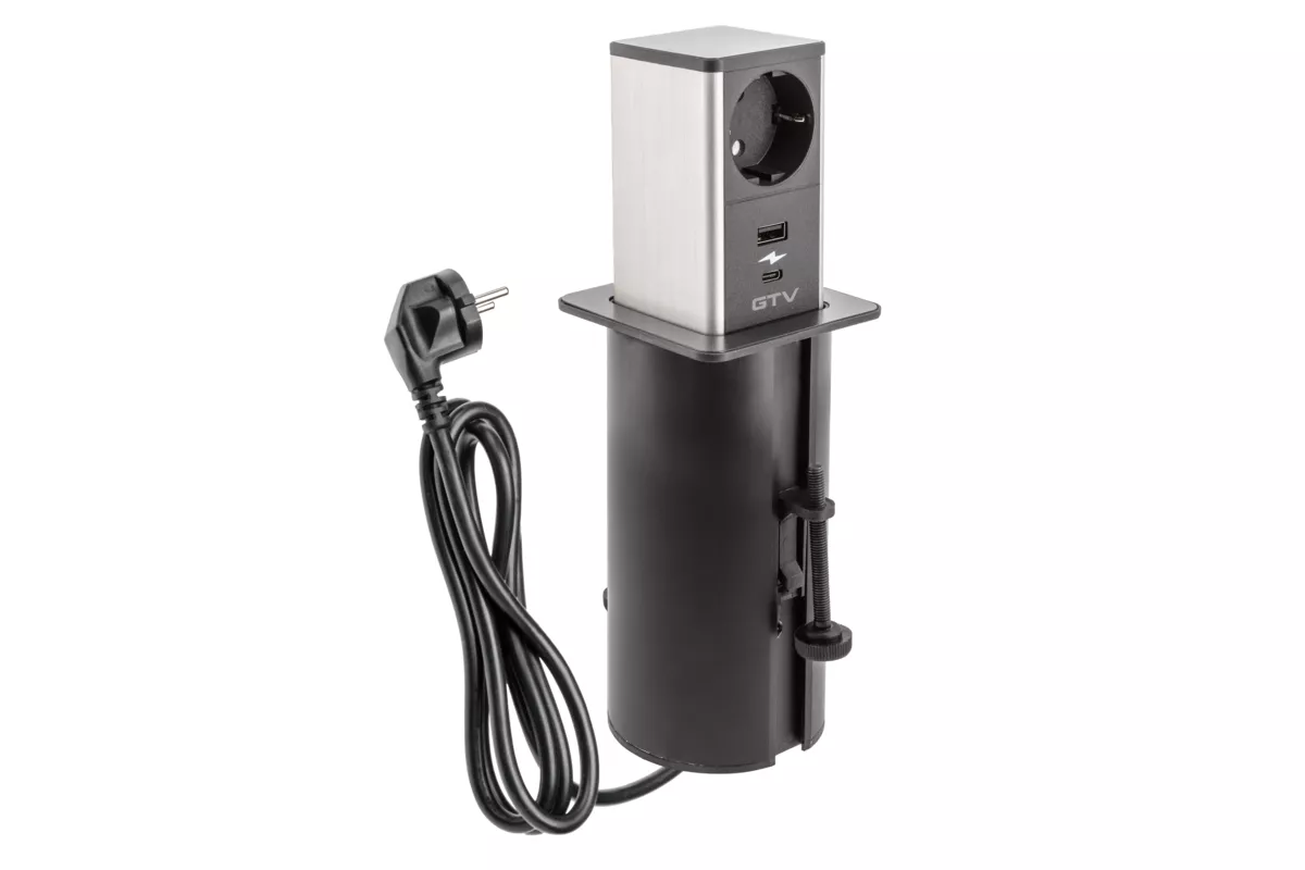 GNIAZDO MEBLOWE WYSUWANE TOWER, 1x GNIAZDO SCHUKO, 1xUSB A, 1xUSB , KABEL 1,5m, CZARNE, KAPSEL INOX