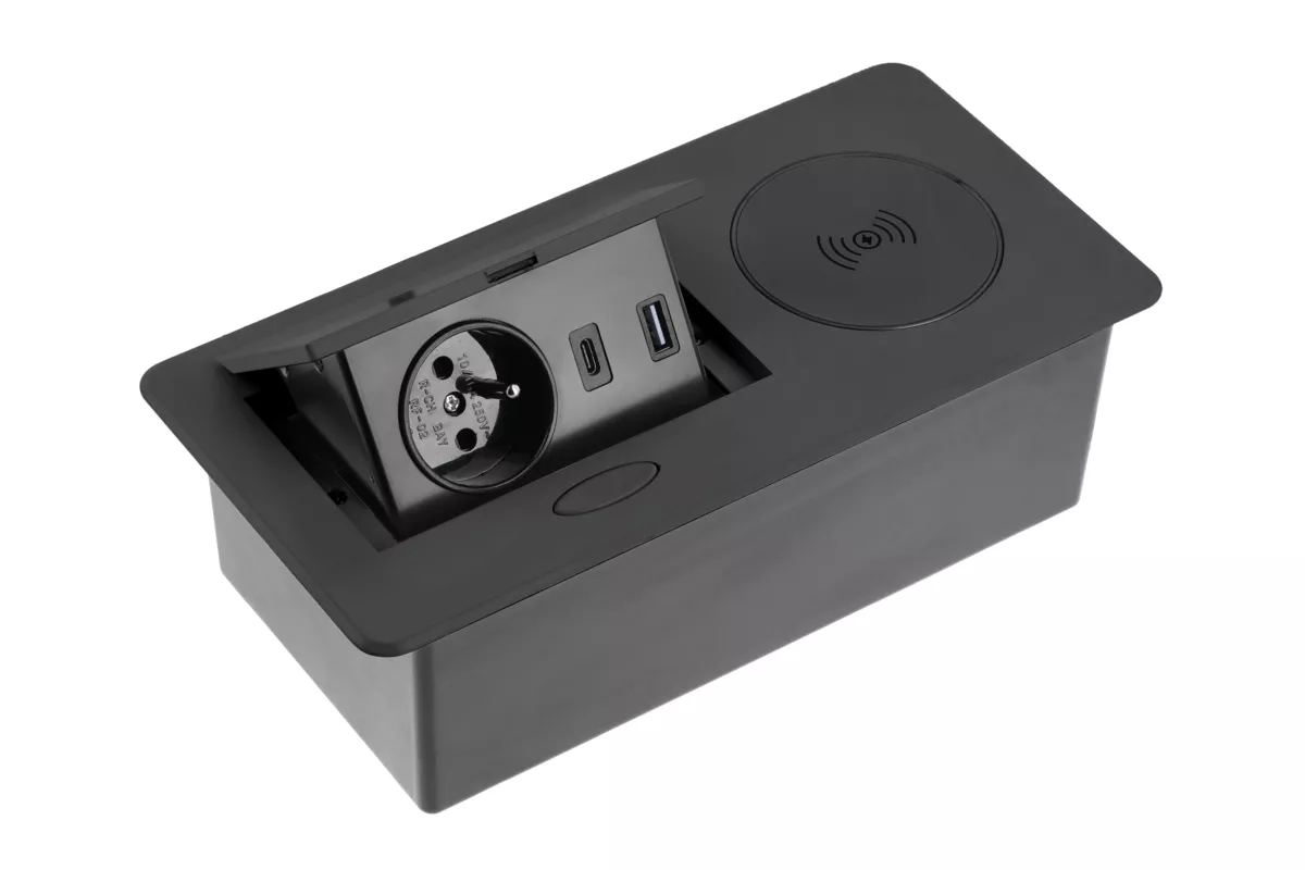 PRZEDŁUŻACZ BIURKOWY WPUSZCZANY AVARO PLUS,1x GNIZDO FRENCH, USB A+C, ŁADOWARKA INDUKCYJNA 5W, PRZEWÓD 1,5m, CZARNY