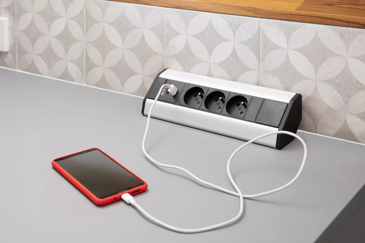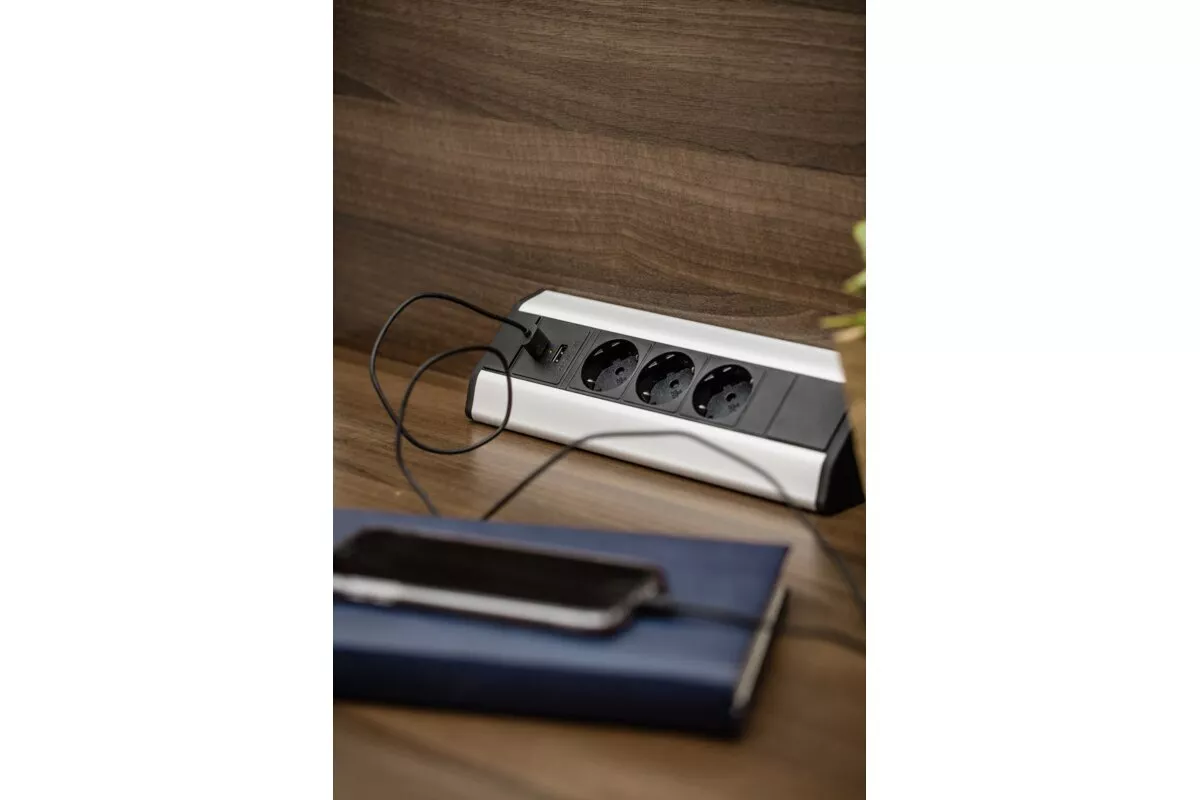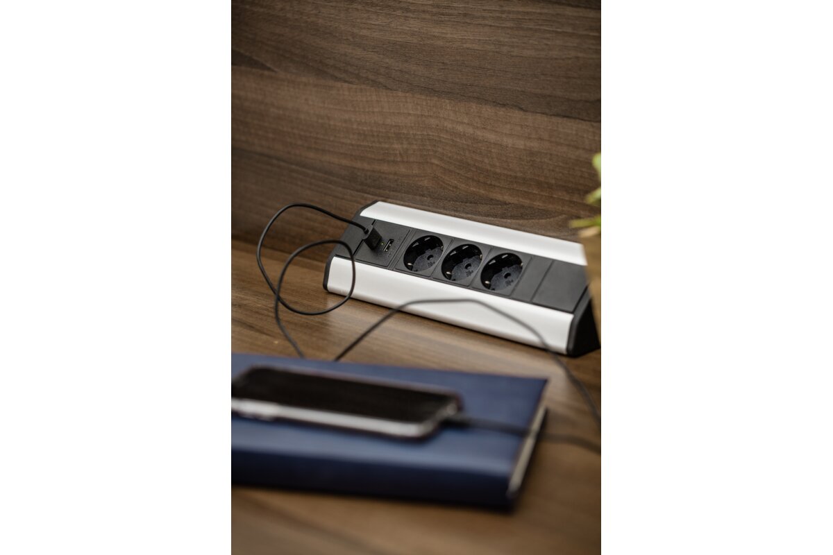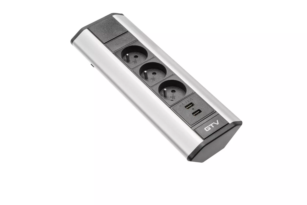PRZEDŁUŻACZ BIURKOWY KĄTOWY 3X GNIAZDO Z UZIEMIENIEM, 2XUSB 2.1A 5V (SREBRNY)