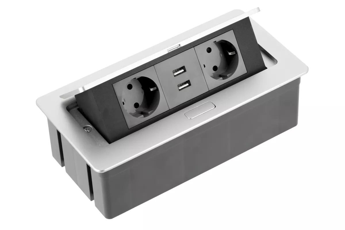 PRZEDŁUŻACZ BIURKOWY SOFT 2X GNIAZDO SCHUKO, USB 2,1A, KABEL ZASILAJĄCY Z WTYCZKĄ, ALUMINIUM