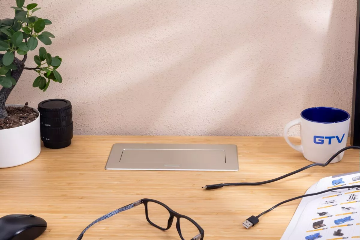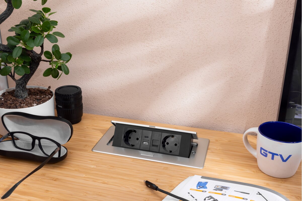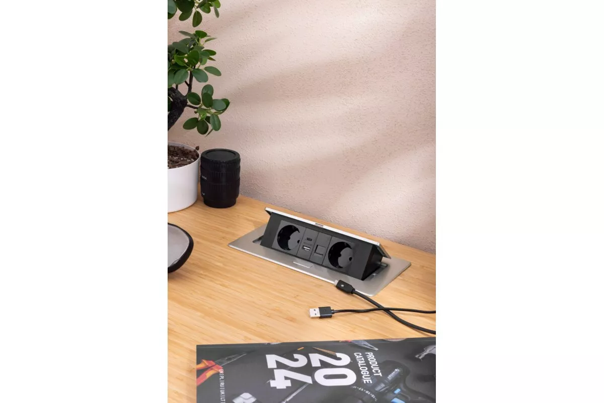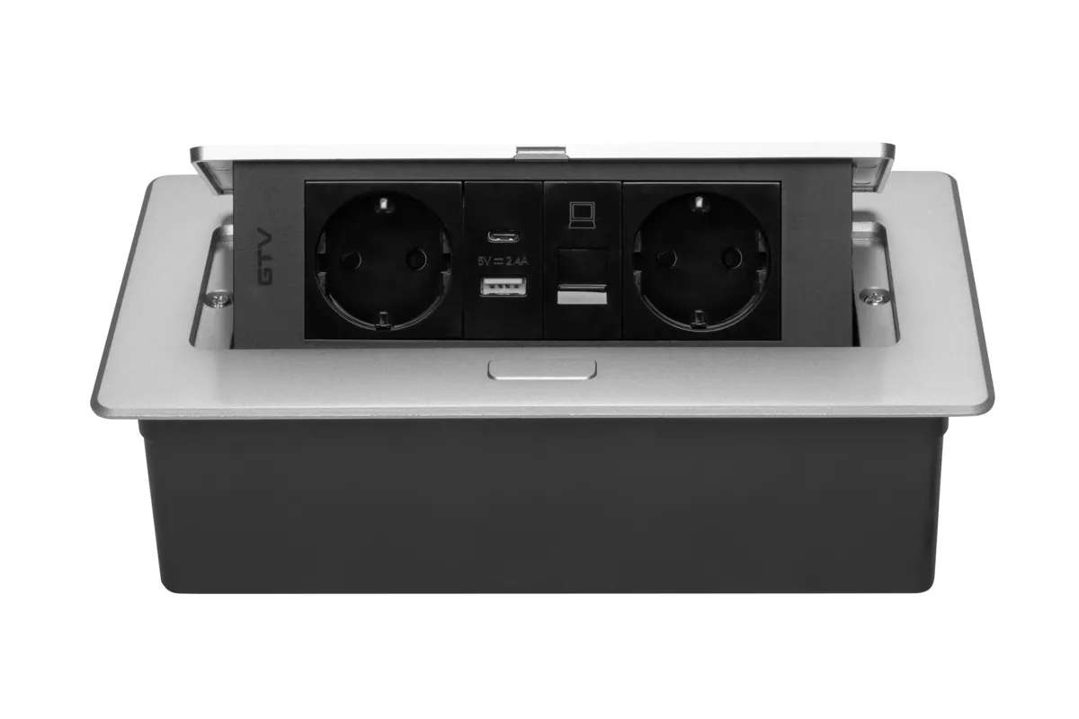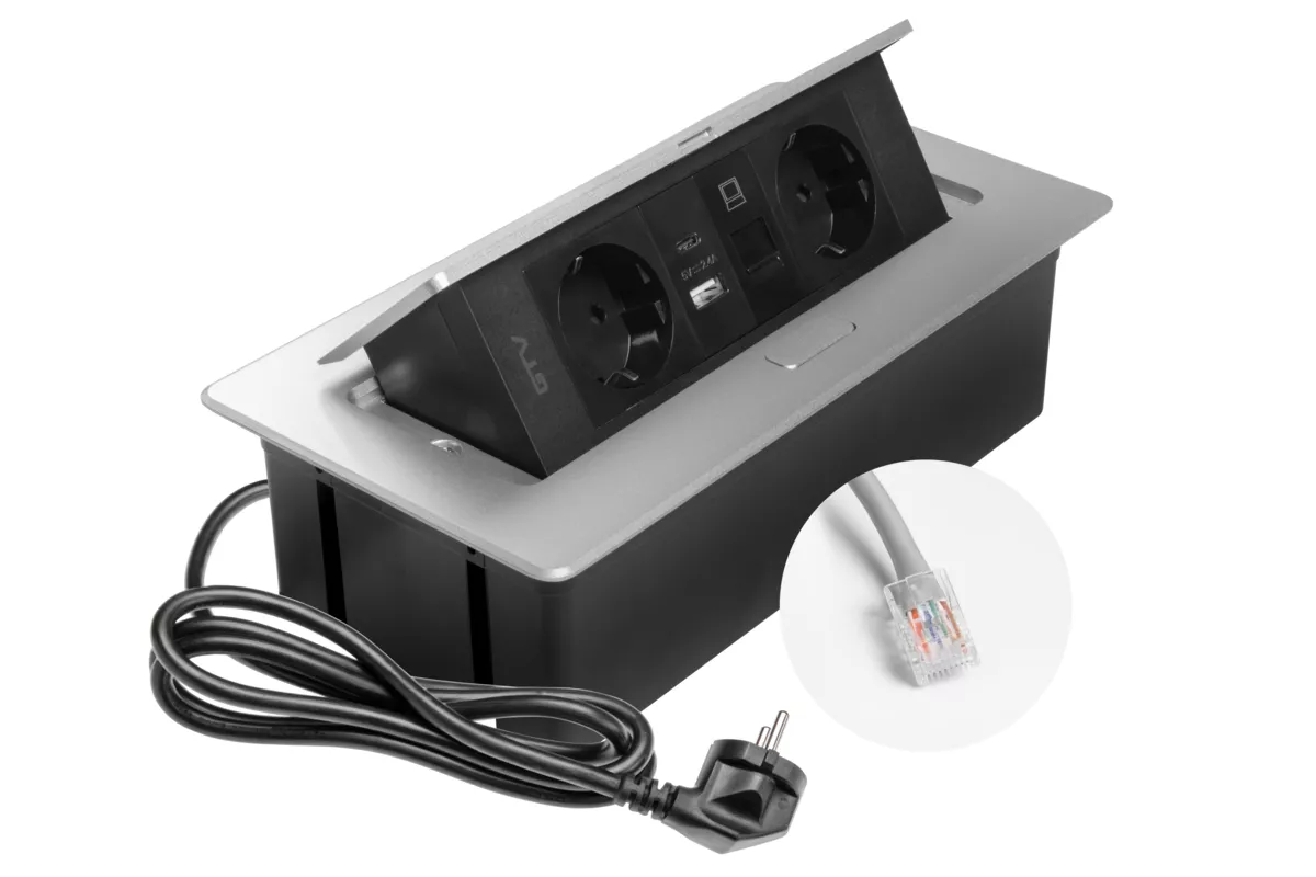 GNIAZDO MEBLOWE MULTISOFT 2X GNIAZDO SCHUKO, USB A+C, RJ45, KABEL ZASILAJĄCY Z WTYCZKĄ, ALU