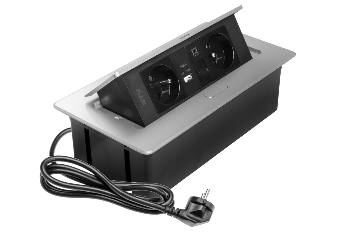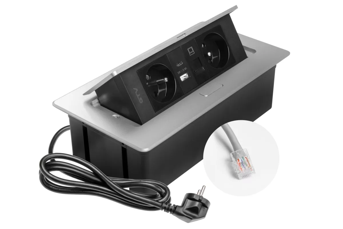 GNIAZDO MEBLOWE MULTISOFT 2X GNIAZDO Z UZIEMIENIEM, USB A+C, RJ45, KABEL ZASILAJĄCY Z WTYCZKĄ, ALU