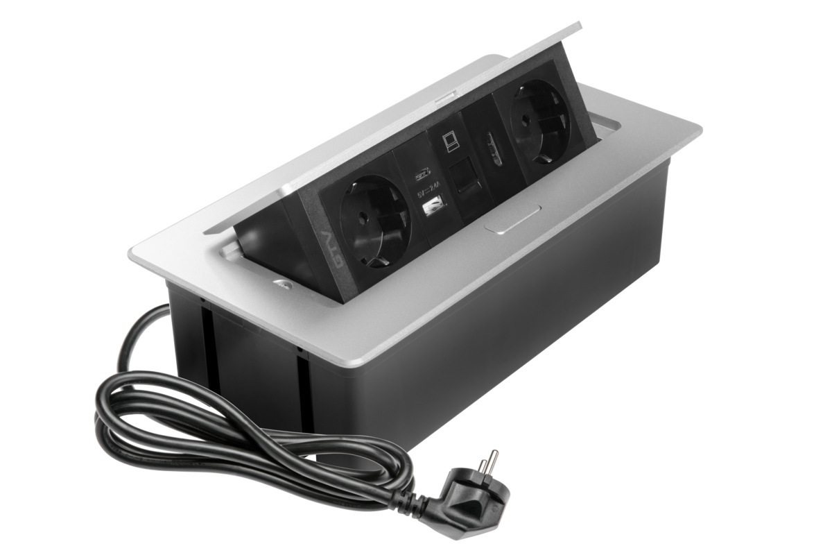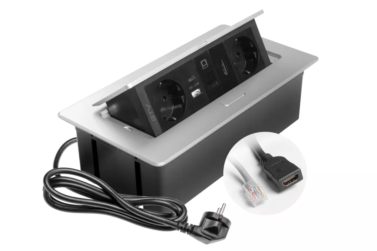 GNIAZDO MEBLOWE MULTISOFT 2X GNIAZDO SCHUKO, USB A+C, RJ45, HDMI, KABEL ZASILAJĄCY Z WTYCZKĄ, ALU