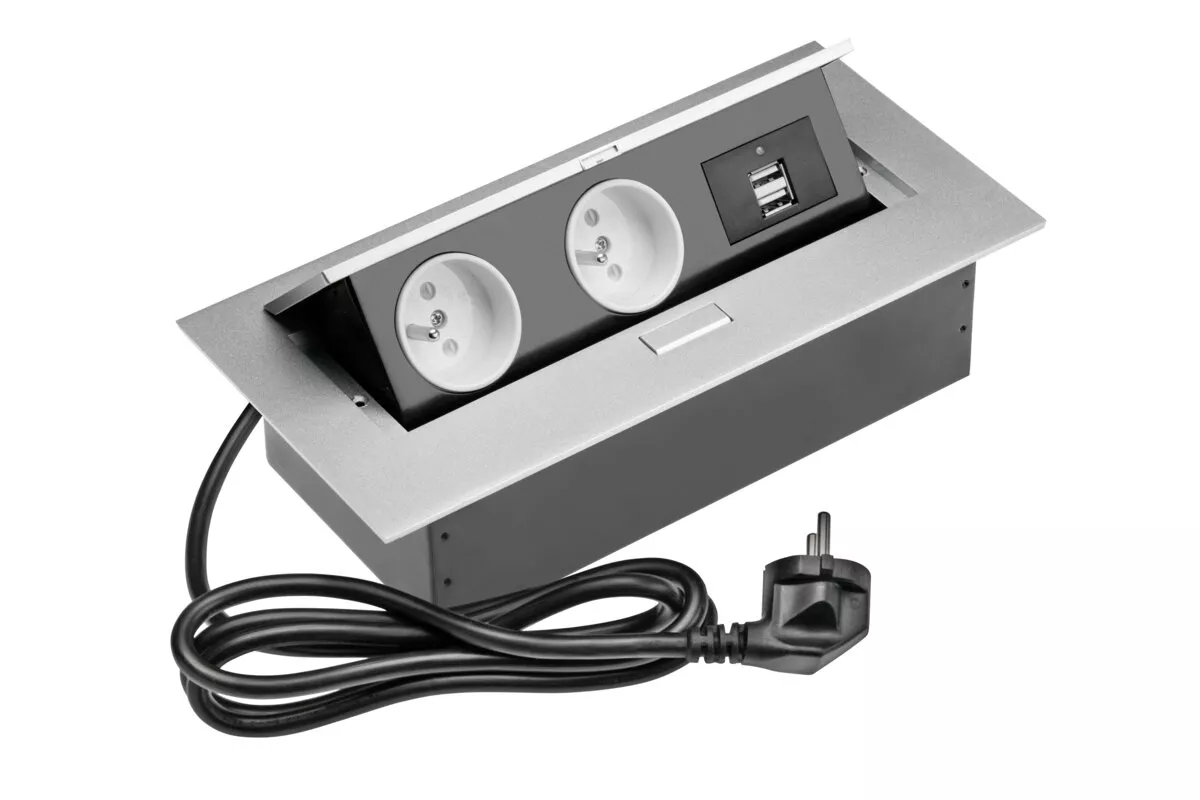 PRZEDŁUŻACZ BIURKOWY 2X GNIAZDO Z UZIEMIENIEM, 2XUSB, KABEL ZASILAJĄCY Z WTYCZKĄ, ALUMINIUM