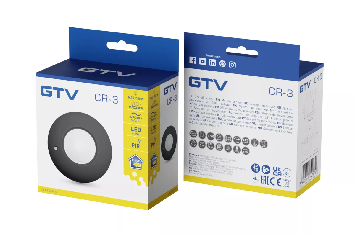 CZUJNIK RUCHU CR-3, max. 1200W, AC 220-240V, 50/60Hz, KĄT DZIAŁANIA 360*, ZASIĘG 6m ± 2,2-4m, IP20, WSPÓŁPRACUJE Z LED, NATYNKOWY, CZARNY