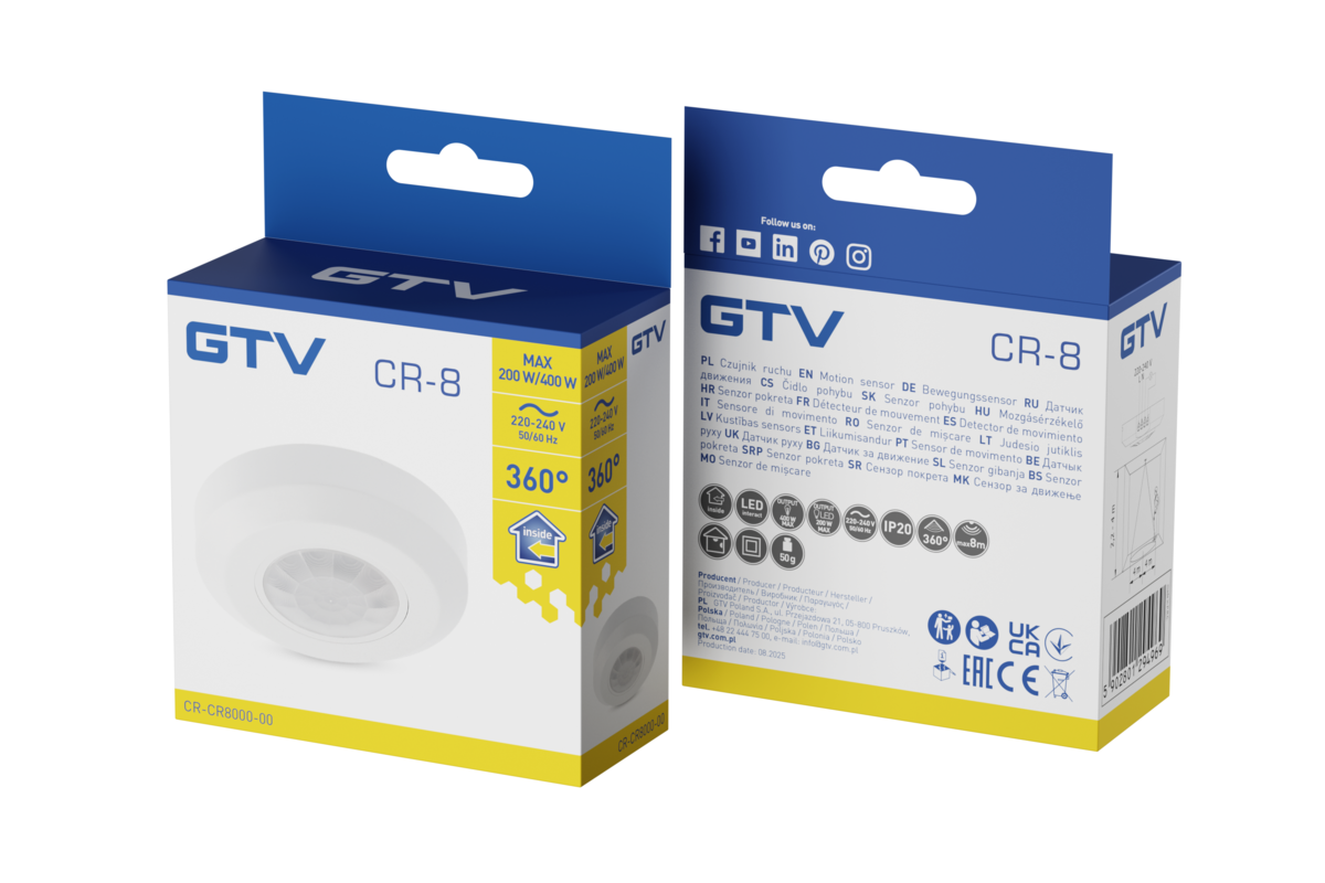 CZUJNIK RUCHU CR-8, max. 2000W, AC220-240V, 50/60Hz, 360°, max.8m, IP44, WSPÓŁPRACUJE Z LED