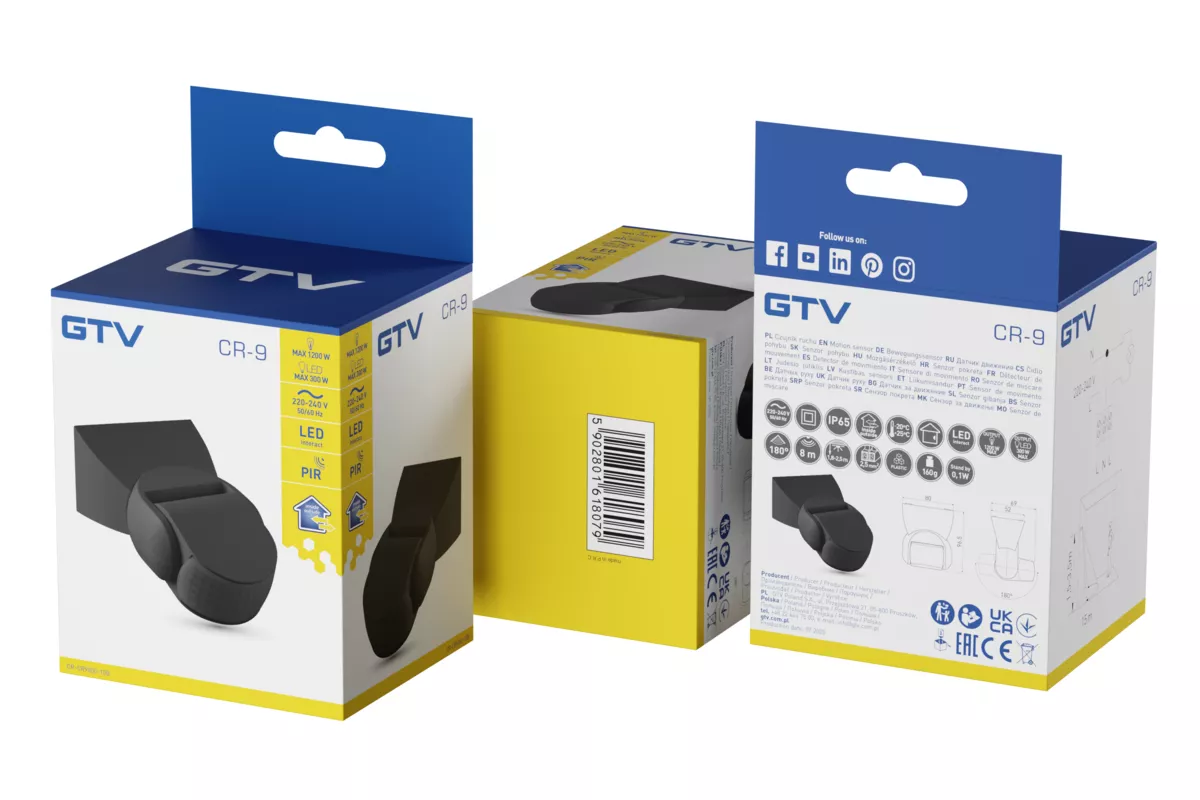 CZUJNIK RUCHU CR-9, max.1200W, AC220-240V, kąt 180°, ZASIĘG 8m, IP65, CZARNY