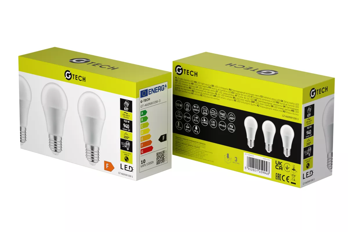 G-TECH ŹRÓDŁO ŚWIATŁA LED, 3pcs., A-G, A60, 4000K, E27, 10,0W, AC220-240V, 200°, 940lm, 87mA