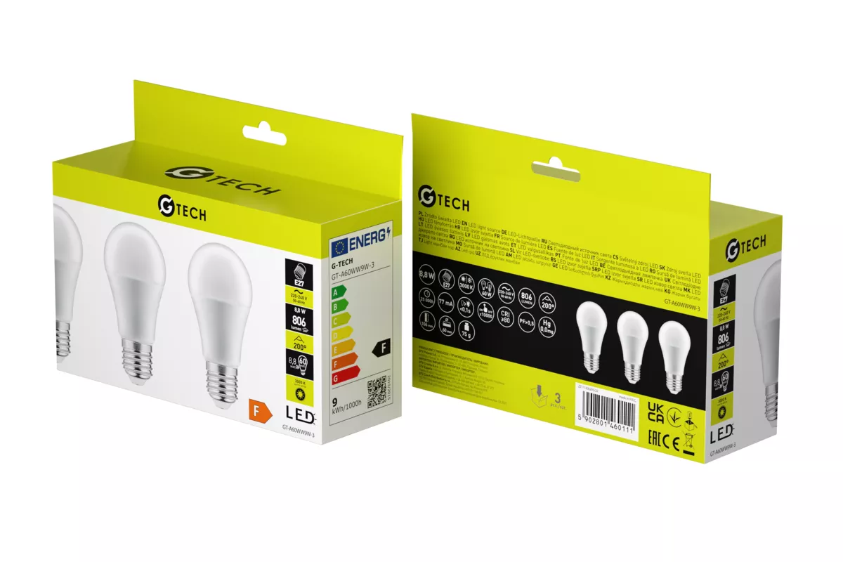 G-TECH ŹRÓDŁO ŚWIATŁA LED, 3pcs., A-G, A60, 3000K, E27, 8,8W, AC220-240V, 200°, 806lm, 77mA