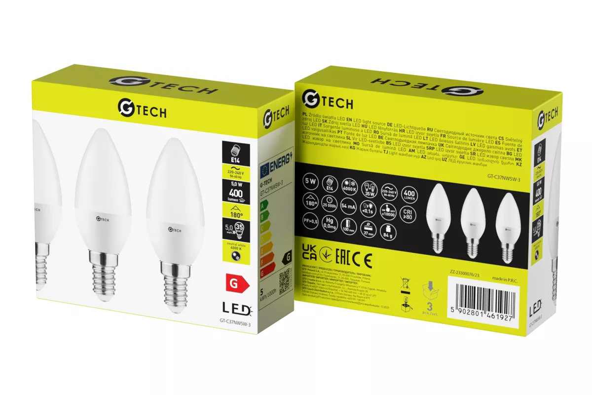 G-TECH ŹRÓDŁO ŚWIATŁA LED, 3pcs., A-G, C37, 4000K, E14, 5,0W, AC220-240V, 180°, 400lm, 54mA