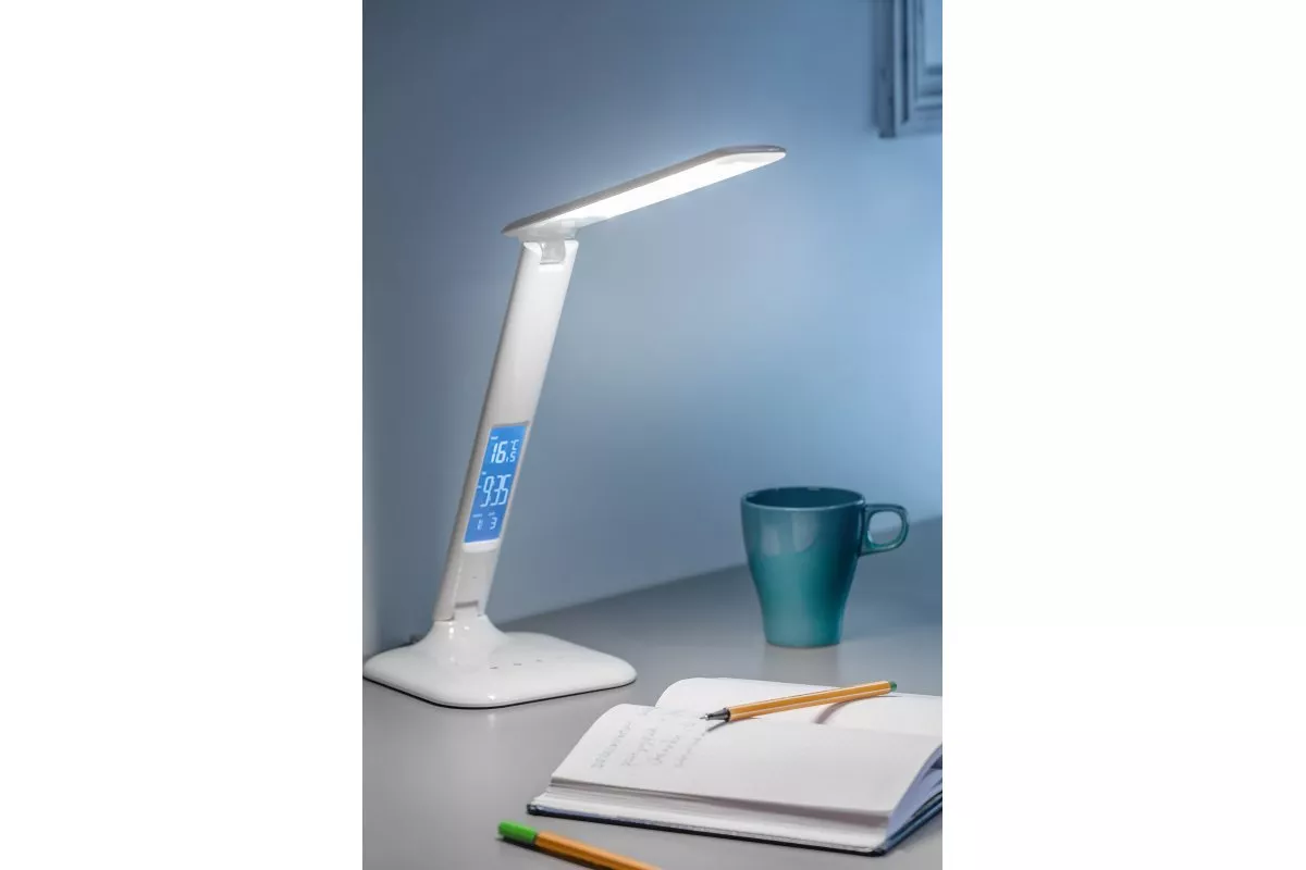 LAMPKA BIURKOWA GALACTIC LED, 5W, 240lm, AC220-240V, 50/60Hz, ZMIENNA BARWA(3000K, 4000K, 6000K) KALENDARZ, BUDZIK, TERMOMETR, BIAŁY