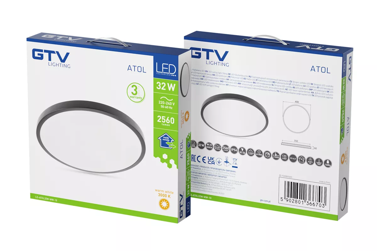 PLAFONIERA ATOL LED, O400mm, 3000K, 32W, 2560lm, A180-250V, 50/60 Hz, PF>0,9, IP54, BLACK, 3y