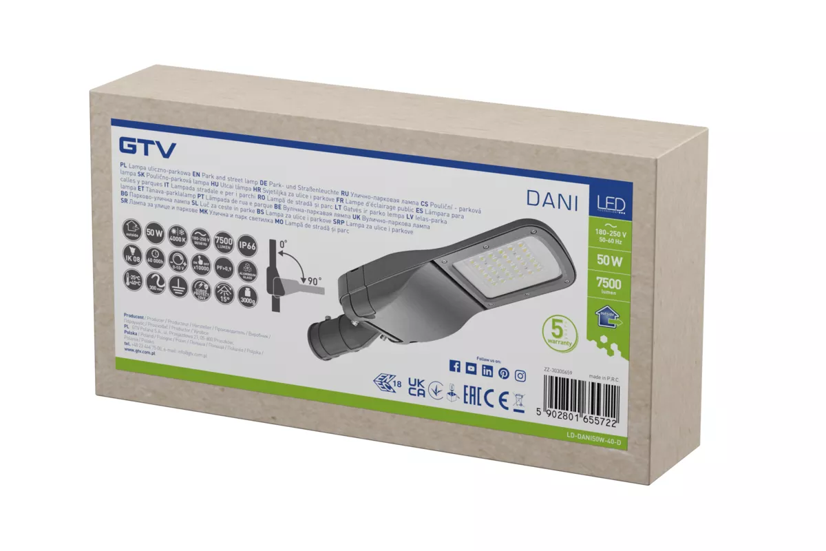 LAMPA ULICZNO PARKOWA DANI, LED, 50W, 7500lm, 4000K, AC180-250V, IP66, IK08, (ENEC)