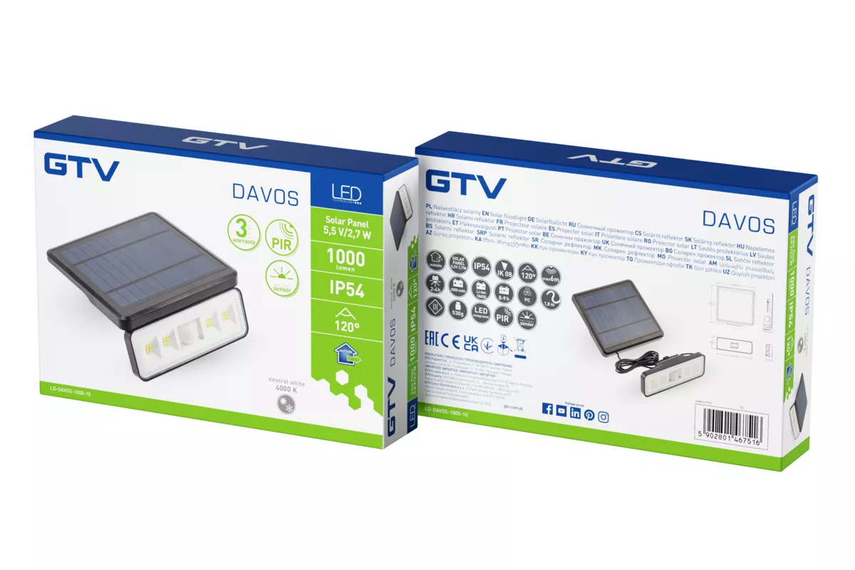 OPRAWA SOLARNA Z CZUJNIKIEM RUCHU I ZMIERZCHU DAVOS, LED, 1000lm, 4000K, 2000mAh, IP54, CZARNY