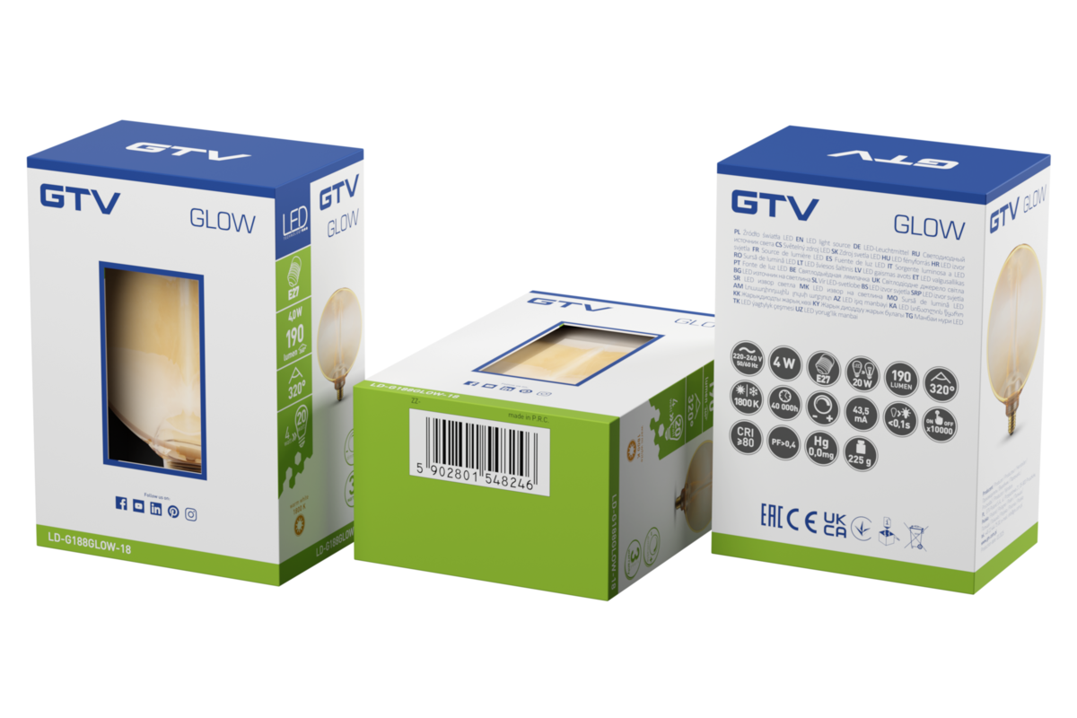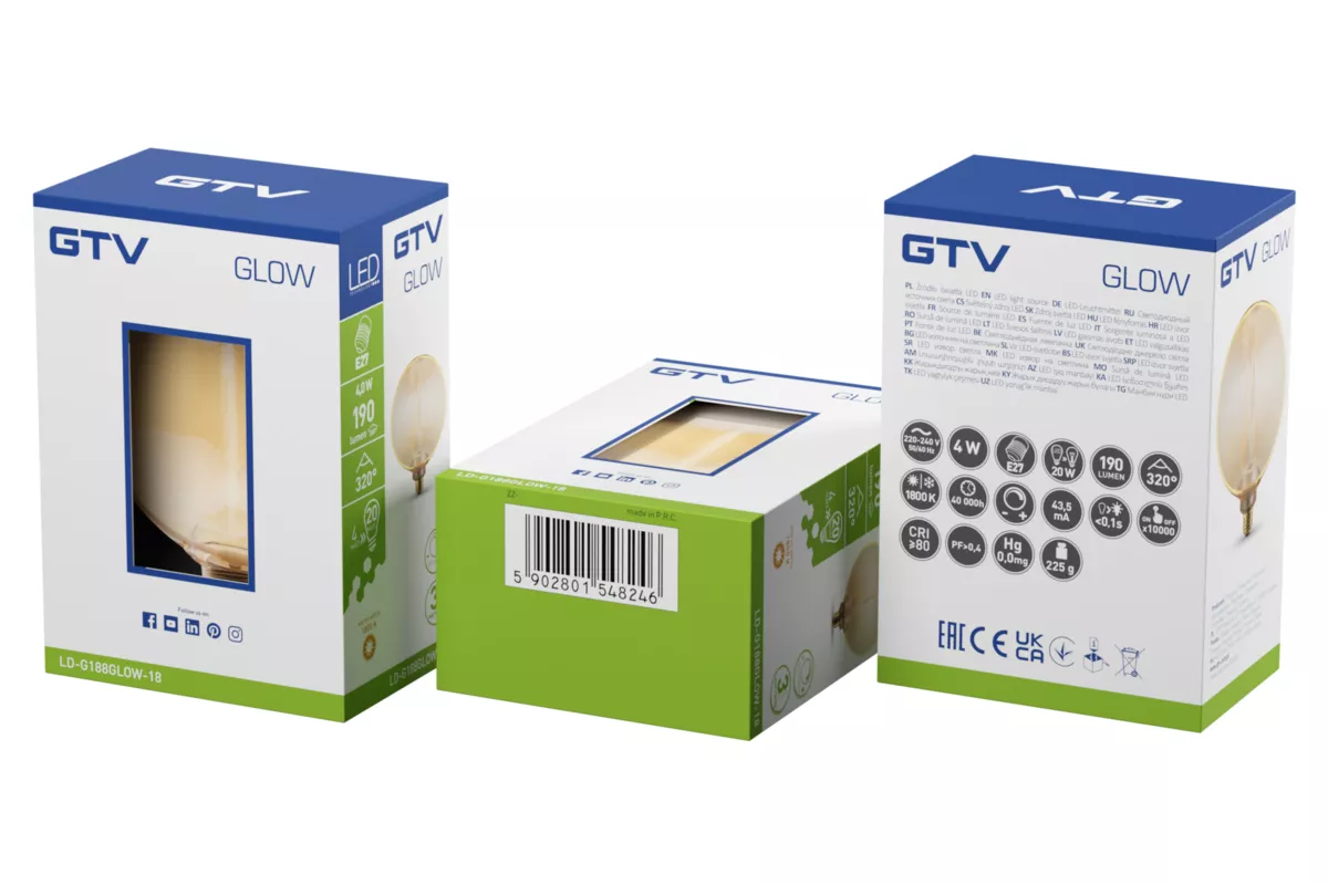ŹRÓDŁO ŚWIATŁA LED, GLOW, G188, E27, 4W, 190lm, 1800K, AC220-240V, 320°, ŚCIEMNIALNA