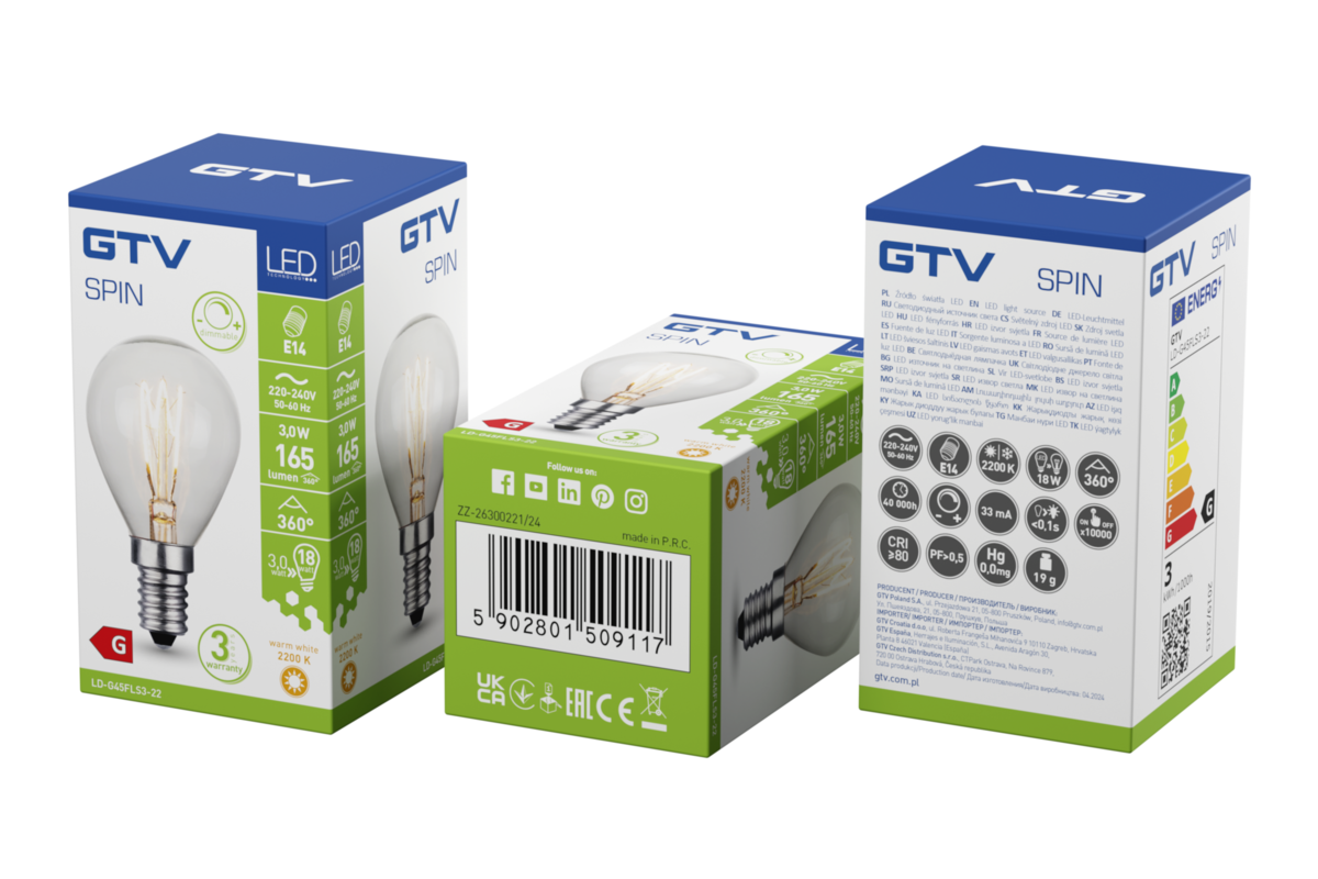 ŹRÓDŁO ŚWIATŁA LED, FILAMENT, SPIN, G45, E14, 3,0W, 165lm, 2200K, AC220-240V, 360°