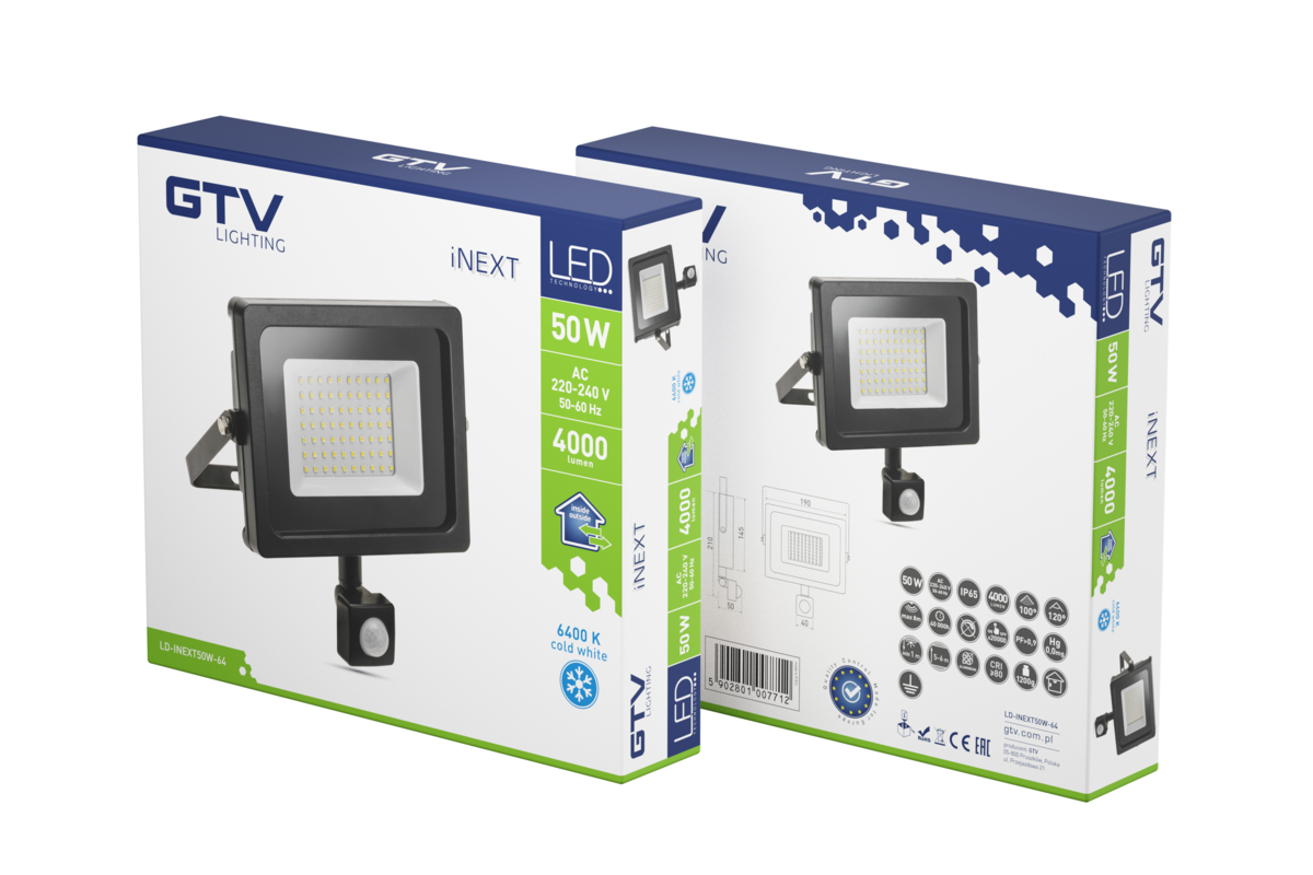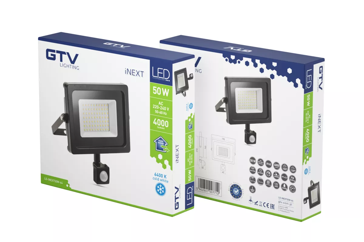 NAŚWIETLACZ LED iNEXT Z CZUJNIKIEM RUCHU, 50W, 4000lm AC220-240V, 50/60 Hz, PF>0,9, RA>80, IP65, 120°, 6400K, CZARNY