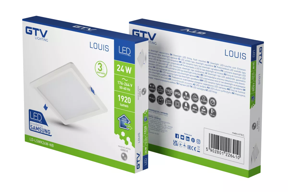 OPRAWA LED LOUIS TYPU DOWNLIGHT, IP54, 24W, 1920lm, AC176-264V, 50/60Hz, 120°, 4000K, WPUSZCZANA, KWADRAT