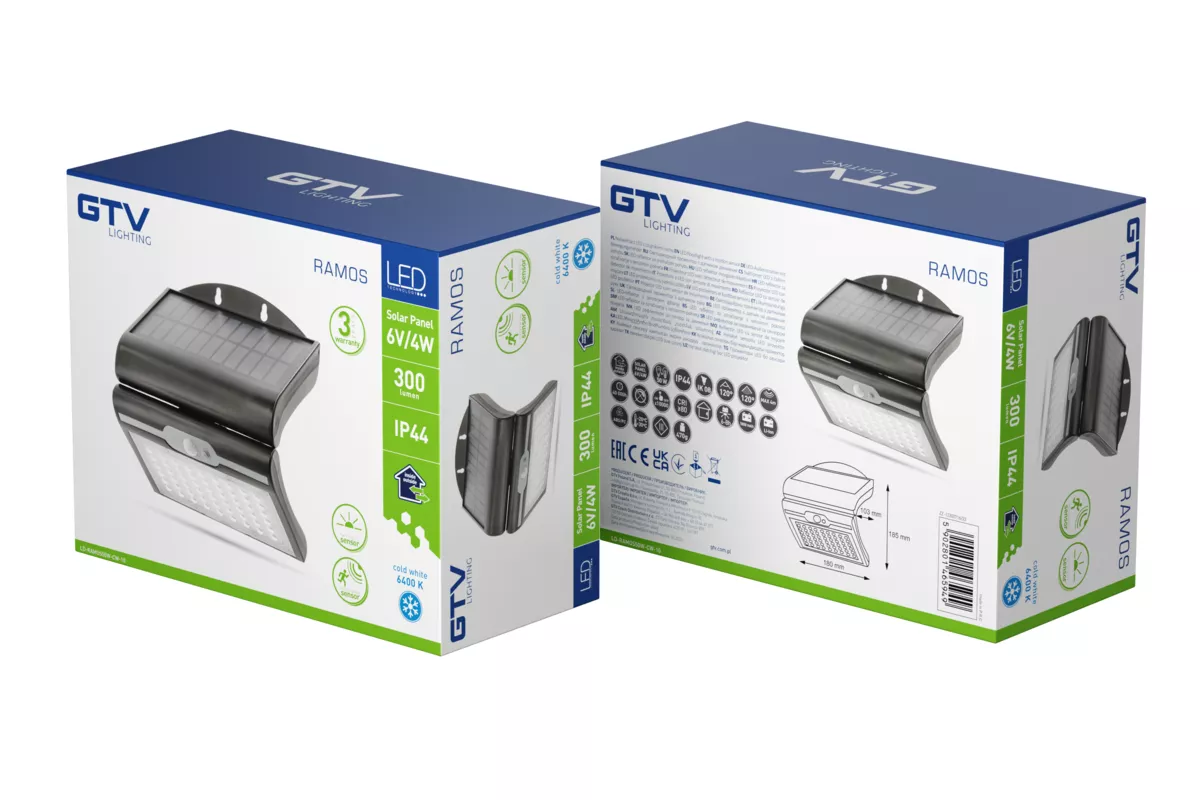 OPRAWA ELEWACYJNA RAMOS SOLARNA Z CZUJNIKIEM RUCHU/ZMIERZCHU, 50W, 300lm, 3,7V 1800mAh, IP44, 6400K, CZARNA