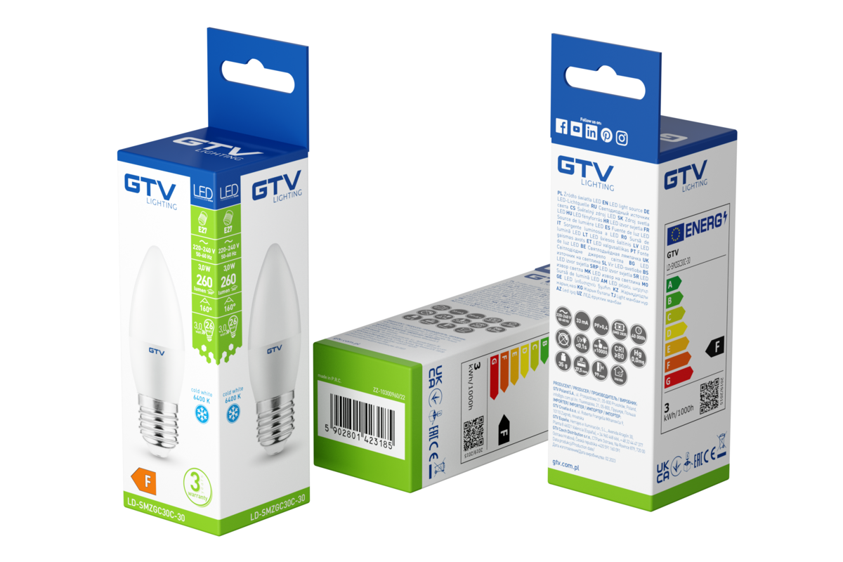 ŹRÓDŁO ŚWIATŁA LED, A-G, C30, SMD 2835, 6400K, E27, 3,0W, AC220-240V, 160°, 260lm, 33mA