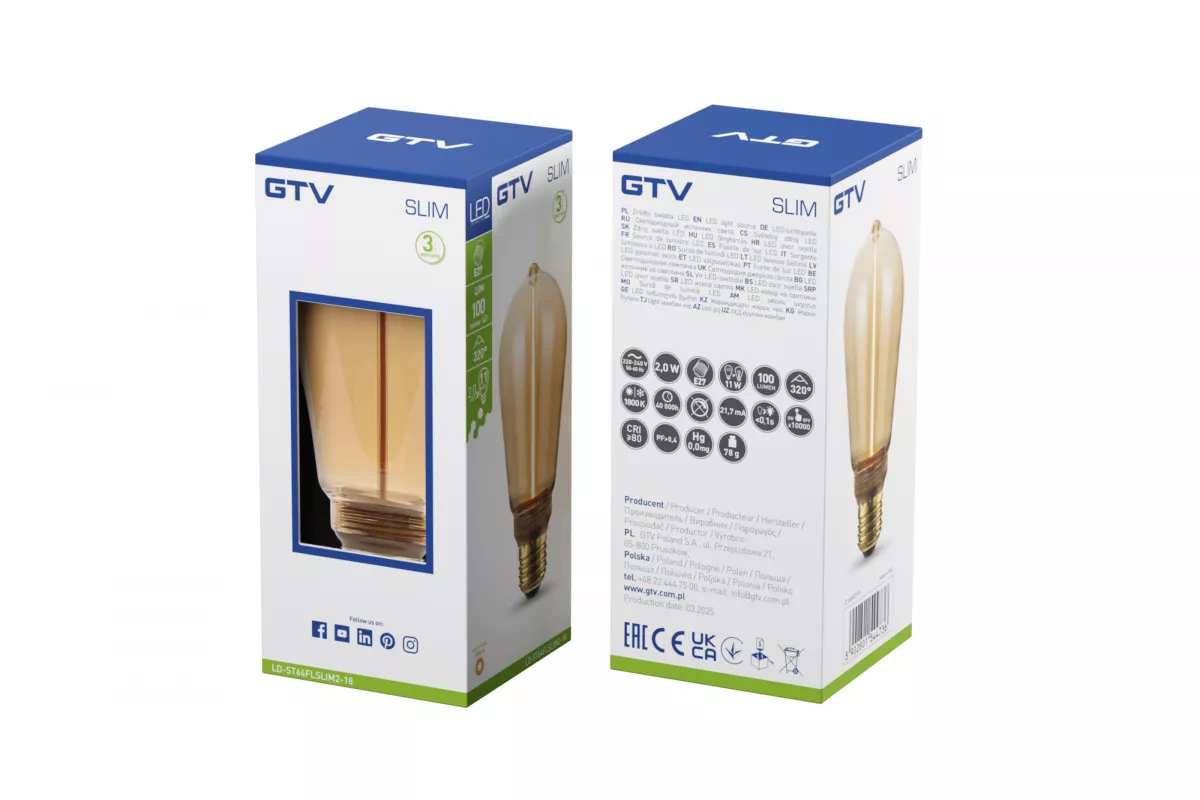 ŹRÓDŁO ŚWIATŁA LED, FILAMENT, SLIM, ST64, E27, 2,0W, 100lm, 1800K, AC220-240V, 320°