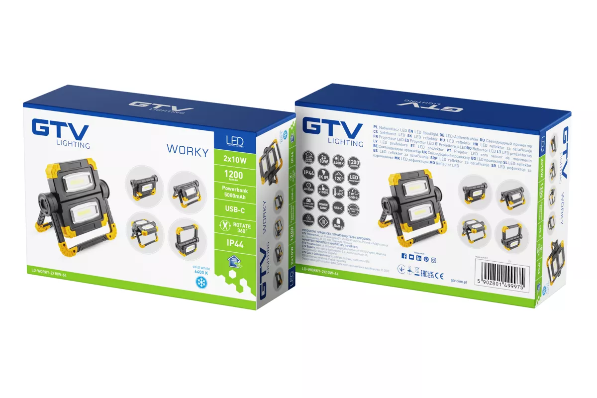 NAŚWIETLACZ WORKY LED, 2x10W COB, 1200lm, 6400K, POWERBANK 5000mAh 5V 1A, USB-C, IP44