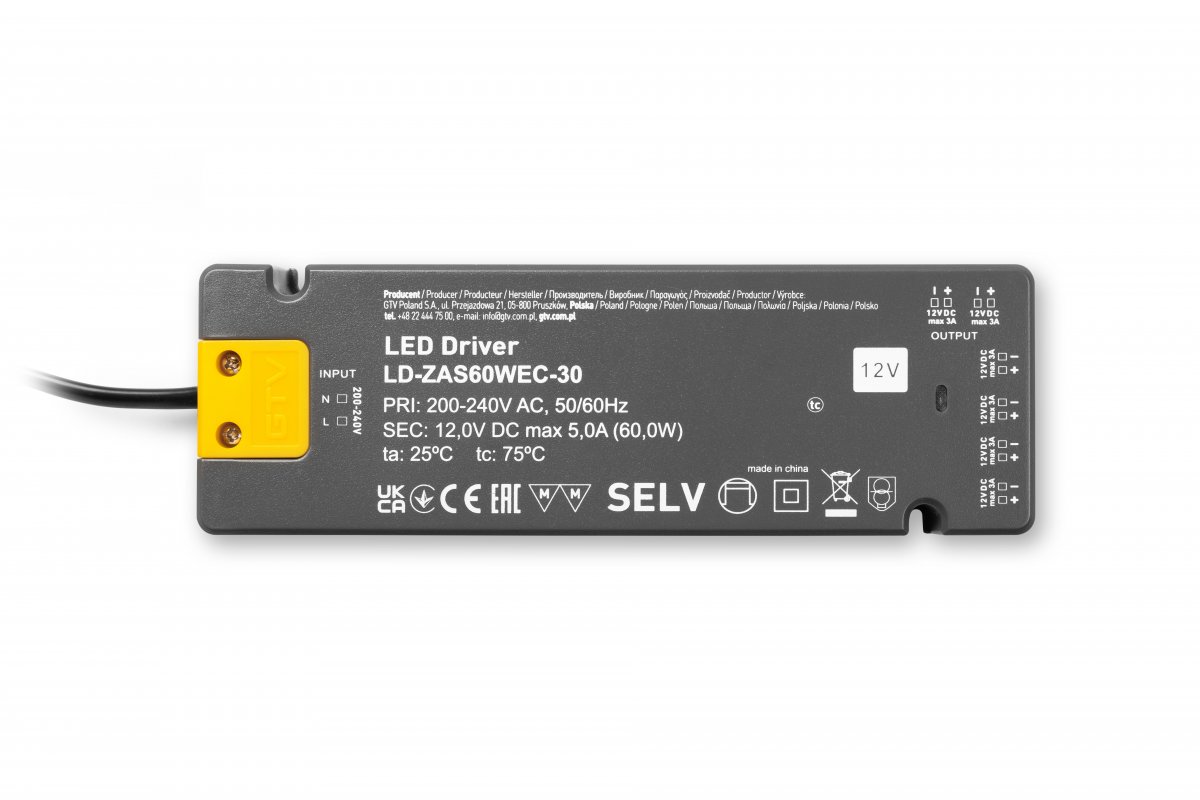 ZASILACZ LED SLIM EASY CLICK 12V,60W, input 220-240VAC, IP20, wym. 190x62x21 mm Z MINI AMP i PRZEWODEM