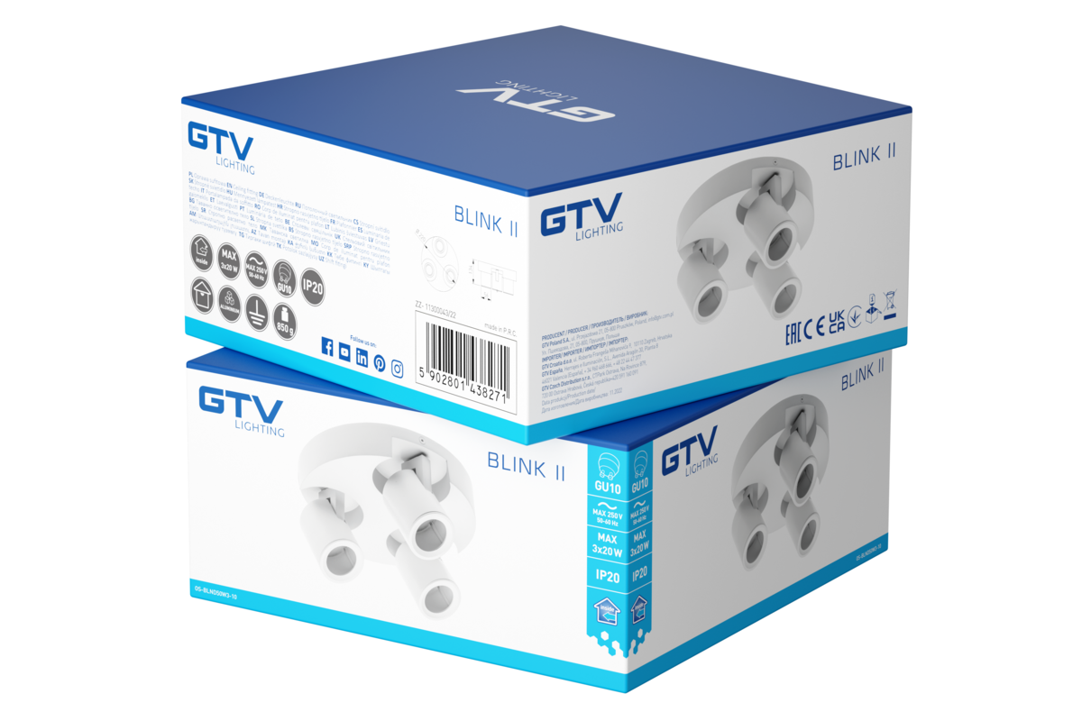 OPRAWA SUFITOWA BLINK II, max. 250V, 50/60 Hz, GU10, max. 20W*3, IP 20, POTRÓJNA, BIAŁA