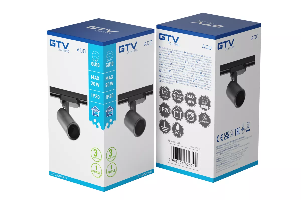 OPRAWA NA SZYNOPRZEWÓD 1-FAZOWY, ADO, GU10, max.20W, AC220-240V, 50/60Hz, IP20, CZARNA