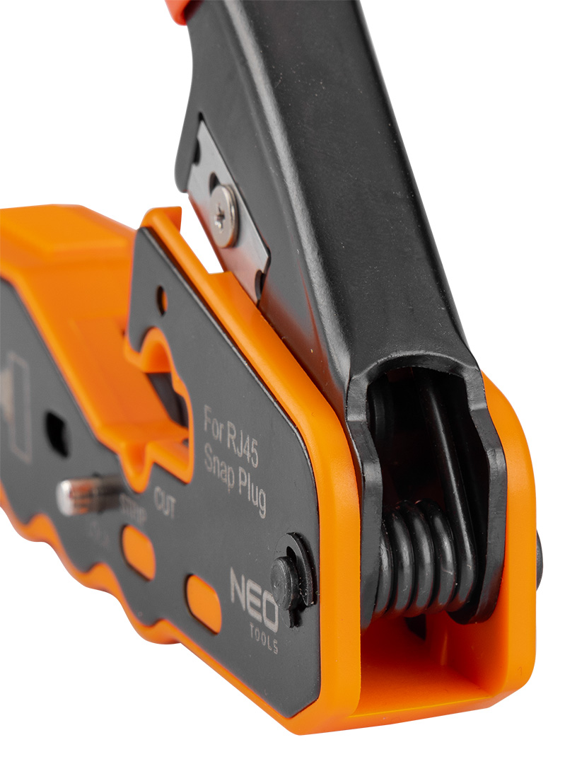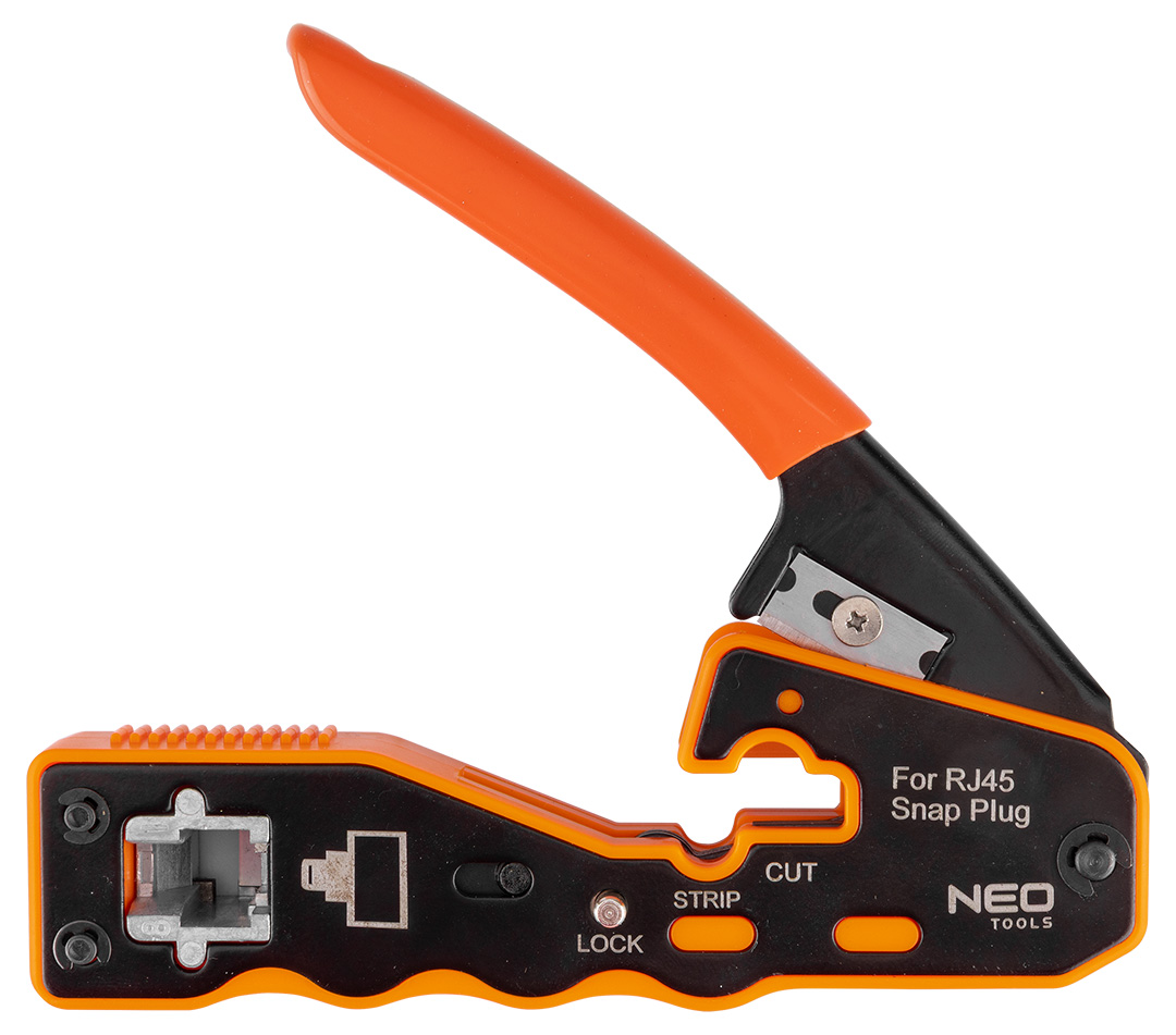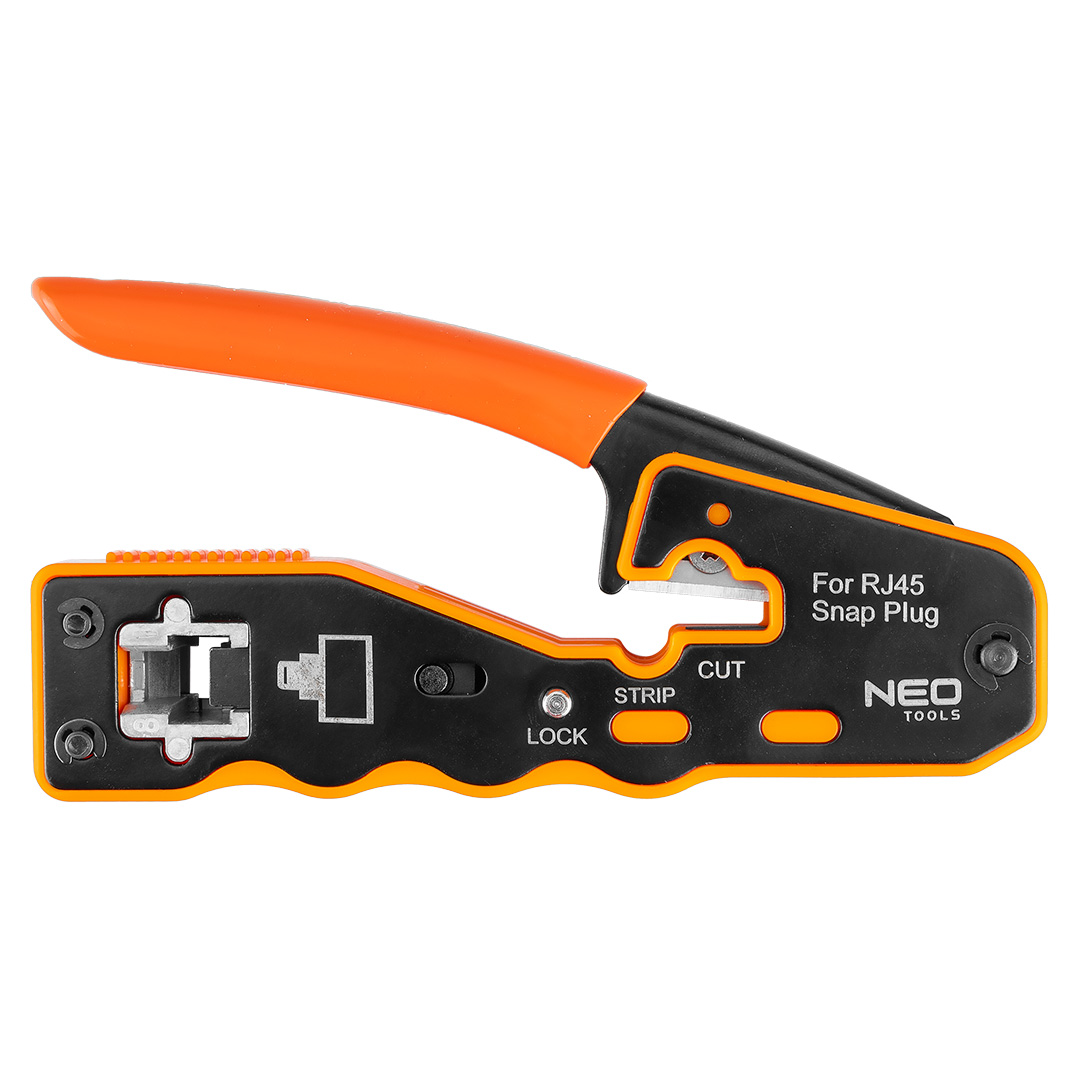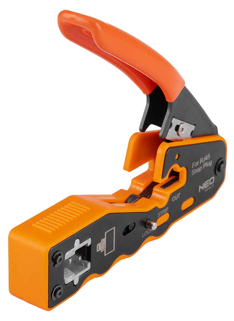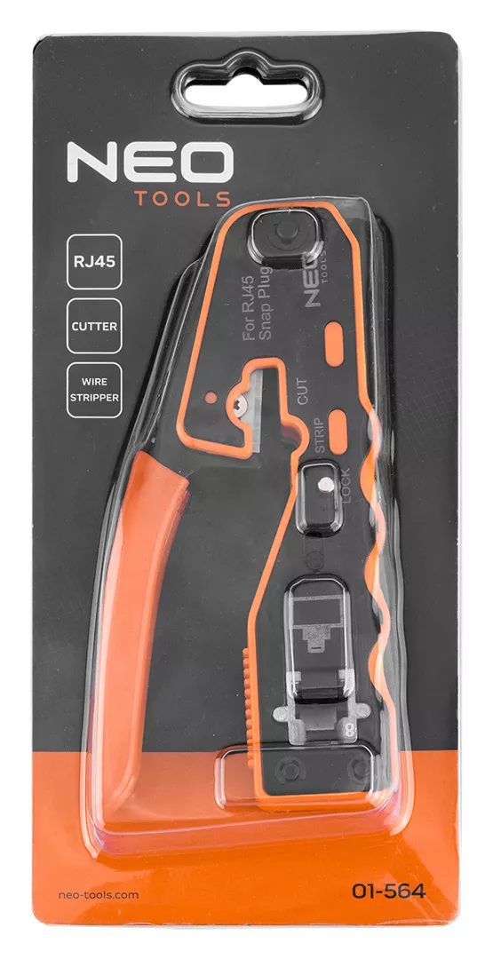 Szczypce do zaciskania wtyków przelotowych RJ45, 01-564 marki NEO TOOLS charakteryzują się długością 135 mm. Wykonane zostały ze stali węglowej, a ich uchwyty to wytrzymałe tworzywo sztuczne. Wyposażone są w obcinak przewodów, ściągacz izolacji oraz blokadę ostrza. Narzędzie marki NEO TOOLS przeznaczone jest do zaciskania przewodów internetowych i telefonicznych. Sprawdzi się w wielu zadaniach.