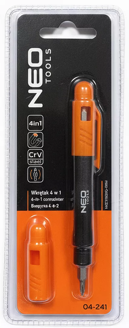 Mini wkrętak 4 w 1, bity: SL3, SL4, PH0, PH1, 04-241 marki NEO TOOLS przeznaczony jest do prac warsztatowych i domowych. Narzędzie wyposażone zostało w dwa bity dwustronne wykonane ze stali CrV. Posiada cztery końcówki robocze: SL3, SL4, PH0 oraz PH1. Magnetyczna końcówka ułatwia pracę z wkrętami i poprawia precyzję podczas wkręcania. Wkrętak ma formę długopisu, dzięki czemu jest poręczny i zajmuje mało miejsca, co też sprzyja wygodnemu przenoszeniu i przechowywaniu. Mikro-chropowata rękojeść zwiększa pewność chwytu, a kompaktowa konstrukcja pozwala na oszczędność miejsca przy zachowaniu wielofunkcyjności narzędzia.