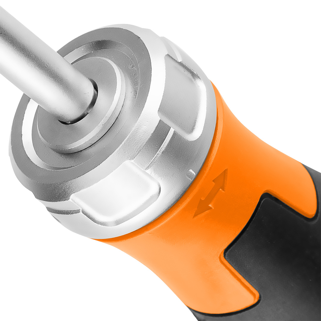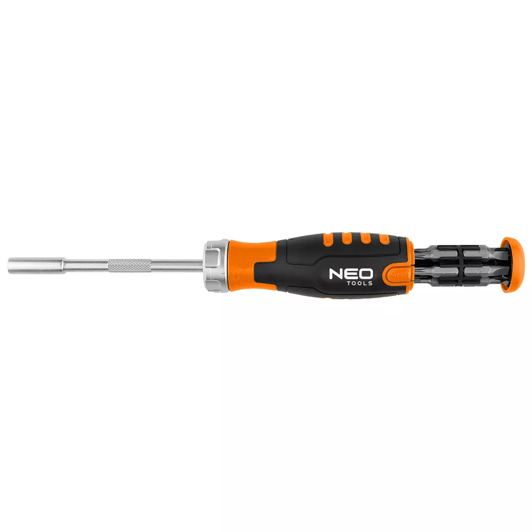 Wkrętak z grzechotką i zestawem bitów 12 sztuk 04-242 marki NEO TOOLS przeznaczony jest do prac warsztatowych i domowych oraz do napraw i regulacji. Narzędzie wykonane ze stali CRV i wyposażone w mechanizm grzechotkowy oraz magnetyczną końcówkę na bity. W zestawie znajduje się 12 bitów o długości 25 mm: płaskie 4, 5 i 6 mm, krzyżakowe PH1, PH2 i PH3, torx T15, T20 i T25 oraz imbusowe H3, H4 i H5. Bity są chowane w uchwycie wkrętaka, co ułatwia ich przechowywanie i zapewnia szybki dostęp do właściwej końcówki. Dwukomponentowy uchwyt zwiększa komfort oraz pewność chwytu podczas pracy, umożliwiając sprawne wykonywanie różnorodnych zadań montażowych i serwisowych.