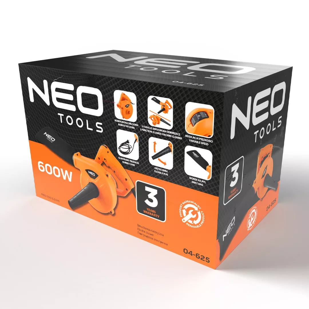 Dmuchawa 600 W 04-625 marki NEO TOOLS to kompaktowe urządzenie, które doskonale sprawdza się w różnych zadaniach ogrodowych. Dzięki regulowanej prędkości obrotowej w zakresie 3000-16 000 obr./min oraz 6-stopniowej regulacji prędkości, można łatwo dostosować jego moc do zadań takich jak zdmuchiwanie liści czy odkurzanie. Urządzenie oferuje przepływ powietrza na poziomie 2,3-3 m³/min i maksymalną prędkość powietrza 285 km/h, zapewniając wysoką efektywność pracy. Dmuchawa marki NEO TOOLS wyposażona jest w worek na liście o pojemności 0,6 litra, a jej obudowa wykonana została z wytrzymałego materiału PA6 gwarantującego trwałość. Funkcja nadmuchu i ssania zwiększa wszechstronność zastosowań, a możliwość obsługi jedną ręką zapewnia wygodę użytkowania. Idealna do prac w domu i ogrodzie, zdmuchiwania, pompowania i odkurzania.
