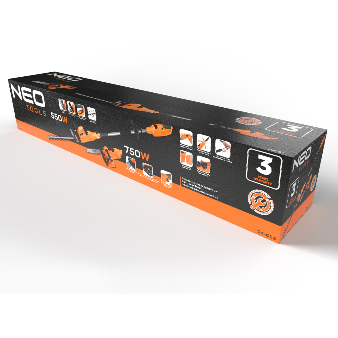 Urządzenie ogrodowe 2w1 z wysięgnikiem: pilarka łańcuchowa 750W 250mm+nożyce do żywopłotu 550W 460mm