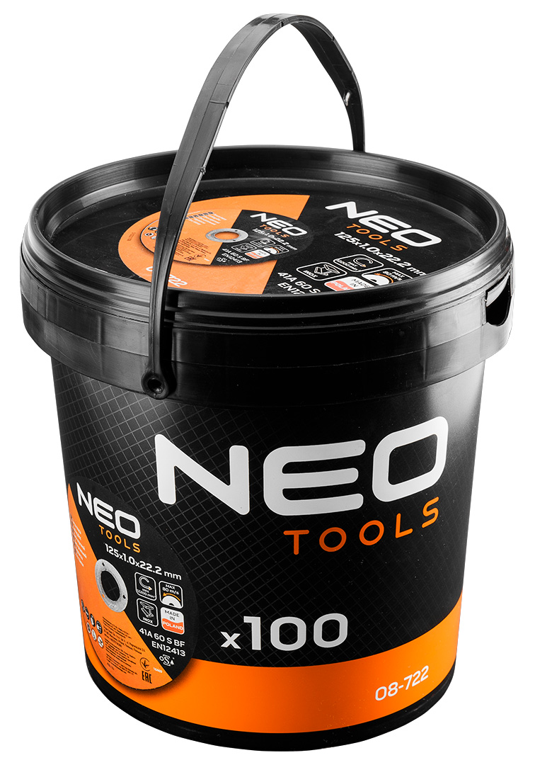 Tarcze tnące do metalu 41 A 60 S BF -125 x 1,0 x 22,2 STAL/INOX, 100 sztuk w wiaderku 08-722 marki NEO TOOLS to polskiej produkcji zestaw 100 tarcz tnących do metalu, oferowanych w wygodnym wiaderku. Tarcze tnące 41 A 60 S BF charakteryzują się średnią 125 mm, grubością 1 mm oraz otworem montażowym 22,2 mm. Osiągające maksymalnie 12 200 obrotów na minutę. Polecane do stali, w tym stali INOX. Doskonale się sprawdzą jako narzędzia zarówno w profesjonalnym jak i hobbystycznym zastosowaniu.